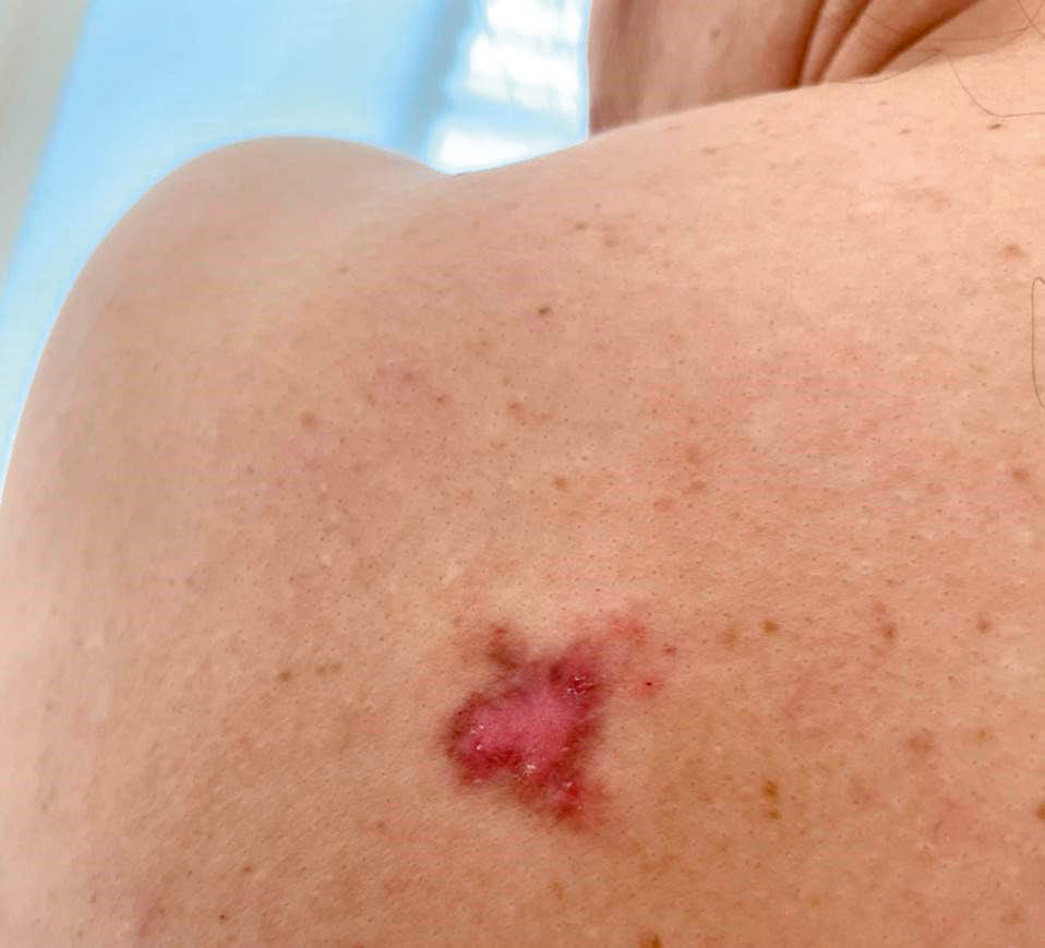 The patient considers herself diseased since February 2020, after the occurrence of itchy rash on the upper back skin. In spring 2020, new multiple lesions occurred, and skin itching increased. The patient consulted a dermatologist at the place of residence; topical therapy with a combination of betamethasone dipropionate ointment and salicylic acid was prescribed. A slight positive effect was achieved. In September 2020, skin biopsy was performed on an outpatient basis; lichen planus was diagnosed based on the study results. Systemic therapy with 4 and 200 mg of methylprednisolone and hydroxychloroquine, respectively, was prescribed for daily use. A positive effect was achieved. In February 2021, the patient voluntarily ceased the drug use, which led to occurrence of new lesions in the breast, back, and shoulder skin areas. The first cicatricial alopecic lesion occurred in the parietal area of the skin. The patient was hospitalized to the inpatient Department of Dermatovenereology of the First Pavlov State Medical University of Saint Petersburg in July 2021.
