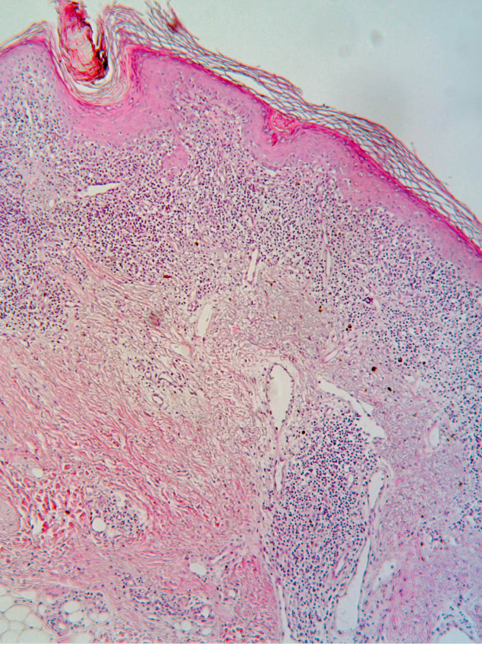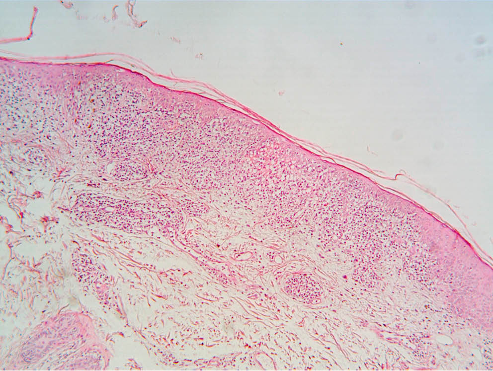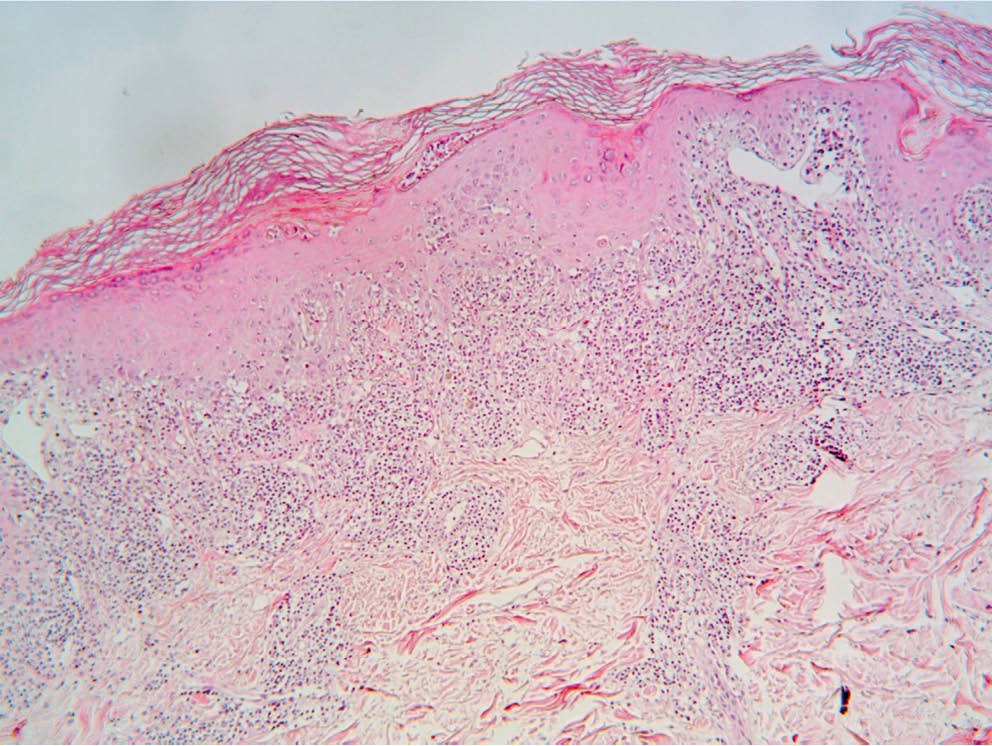 For histological study, biopsy samples of several lesions of the scalp, face, back, and hand areas were obtained. Hyperkeratosis, local parakeratosis, areas of hypergranulosis, band-like lymphocytic–histiocytic infiltrate in the upper dermis, and focal lymphocytic–histiocytic infiltrates around vessels and skin appendages in the middle and lower dermis were observed in the ares of lesions (fig. 5, 6). The pathologist's report is as follows: the described changes better correspond to lichen planus; changes found in the back skin lesion may indicate both lichen planus and lichenoid lupus erythematosus.