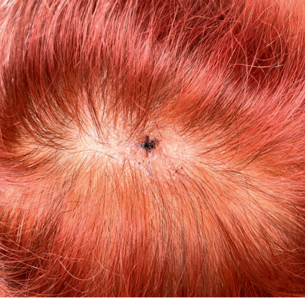 Fig. 8. Patient R. A lesion of cicatricial alopecia on the scalp. A suture was placed at the biopsy site