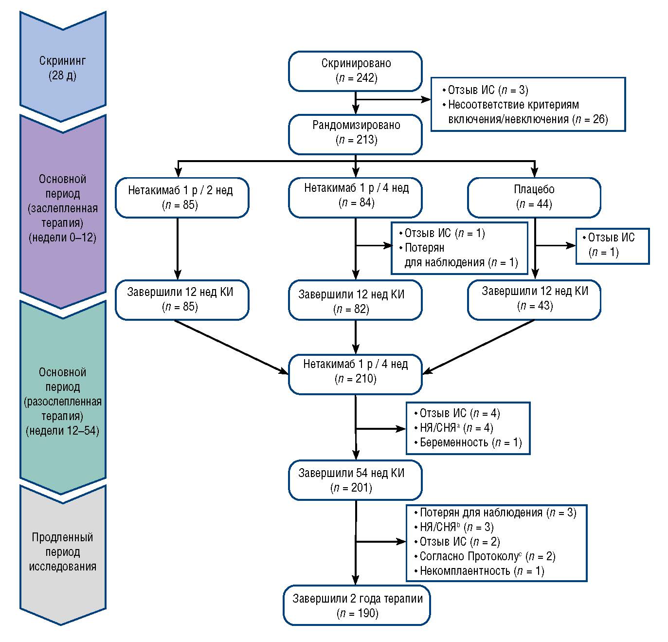После проведения оценки эффективности терапии на 12-й неделе группы переводились на активную терапию (120 мг нетакимаба раз в 4 недели), которую получали открыто. При этом в группе Плацебо пациентам на протяжении первых 3 недель нетакимаб вводили еженедельно, а затем раз в 4 недели. Пациенты, не достигшие PASI 75 на 52-й неделе, досрочно исключались из исследования как не ответившие на терапию. Остальные пациенты продолжили участие в продленном периоде с сохранением той же схемы и дозы терапии.