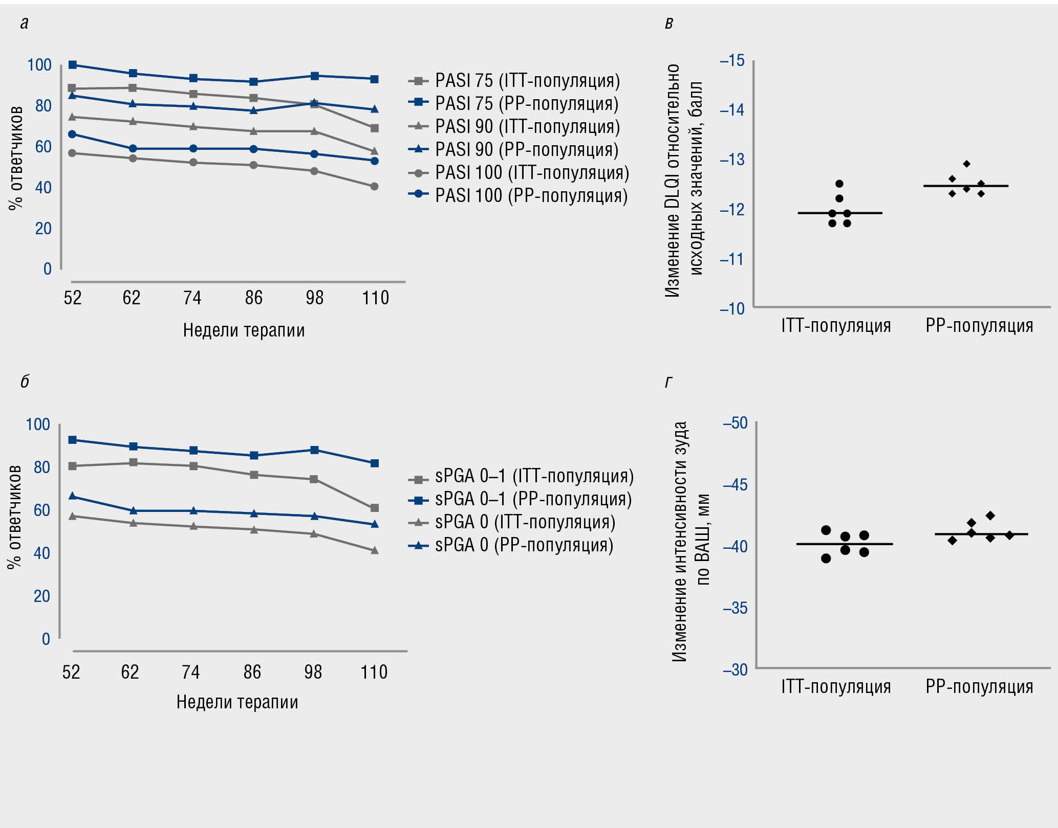 Оценку эффективности проводили на основании доли пациентов, достигших 75, 90 и 100% улучшения индекса PASI; доли пациентов, достигших sPGA 0–1 / sPGA 0 и DLQI 0–1. Качество жизни оценивали по изменению балла DLQI по сравнению с исходными данными. Кроме того, учитывали изменение от исходных значений индекса NAPSI и выраженности зуда по визуальной аналоговой шкале (0–100 мм). Оценка безопасности основывалась на учете нежелательных явлений (НЯ), результатах физикального осмотра, лабораторных и инструментальных исследований. Дополнительно оценивали долю пациентов, у которых обнаруживались связывающие и/или нейтрализующие антилекарственные антитела.