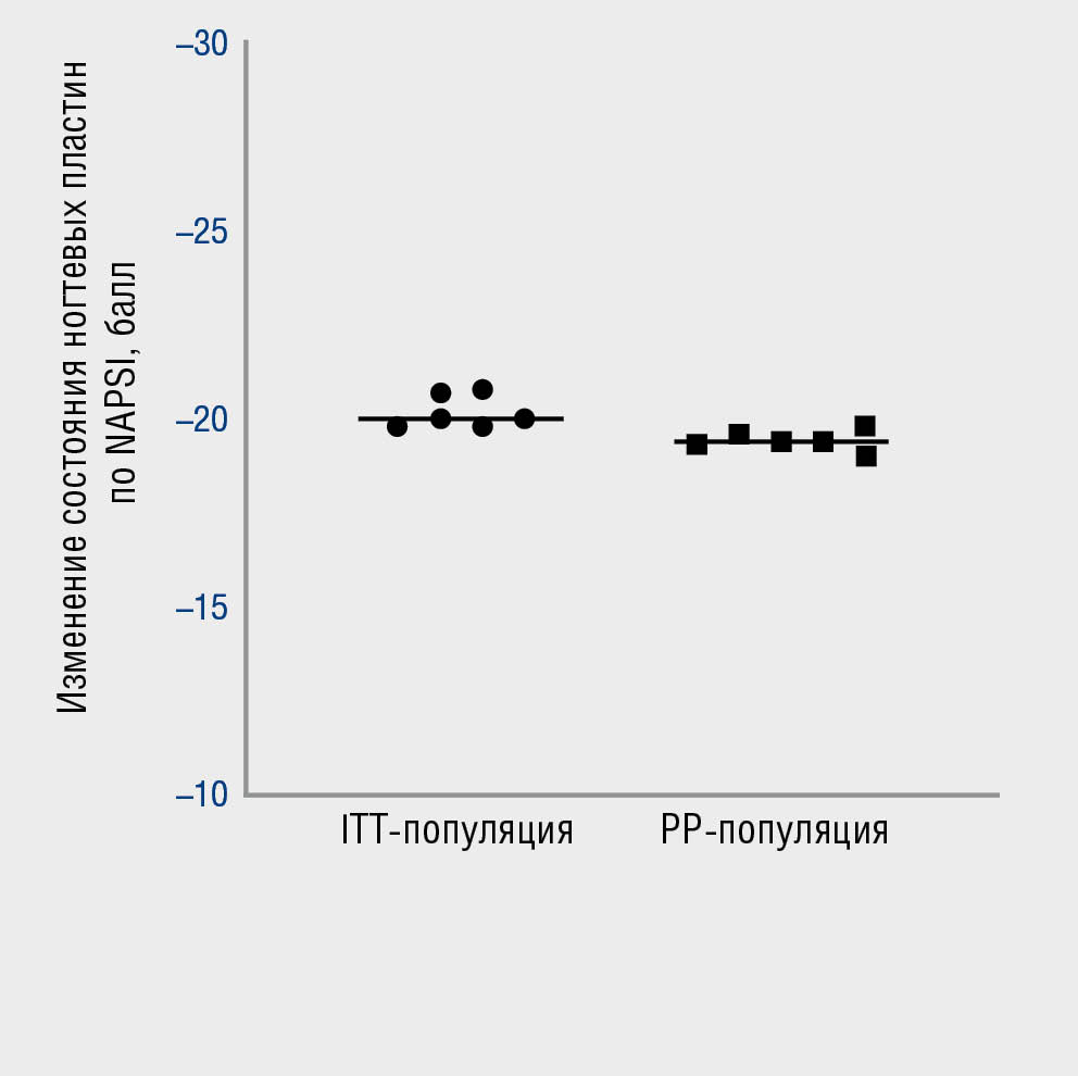 Следует также отметить, что среднее изменение балла NAPSI на протяжении 2 лет терапии в обеих популяциях составило –20 баллов, что с учетом исходных значений свидетельствует о значительном сокращении зоны поражения ногтевых пластин, вплоть до полного исчезновения признака (рис. 3).