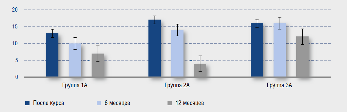 Рис. 1. Количество пациентов в подгруппе А (возраст до 49 лет) с сохранившимся клиническим эффектом после различных методов коррекции