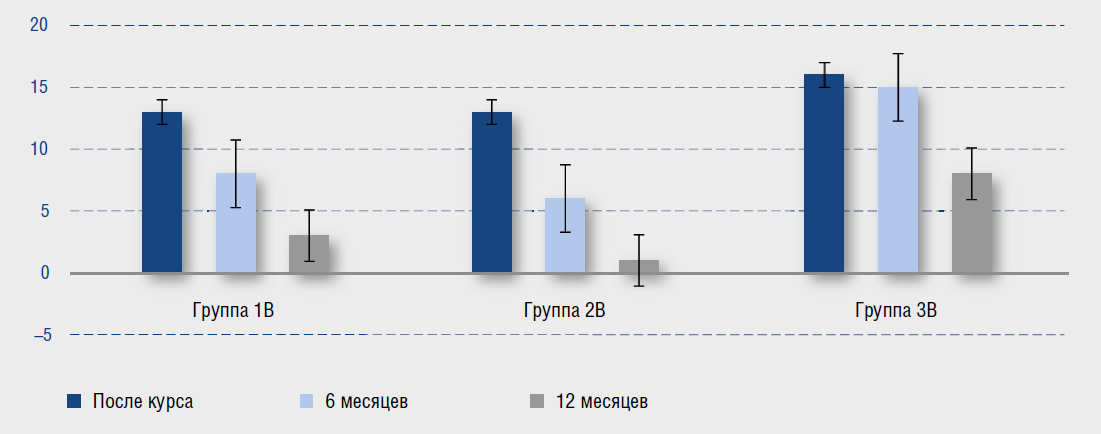Рис. 2. Количество пациентов в подгруппе В (возраст старше 50 лет) с сохранившимся клиническим эффектом после различных методов коррекции