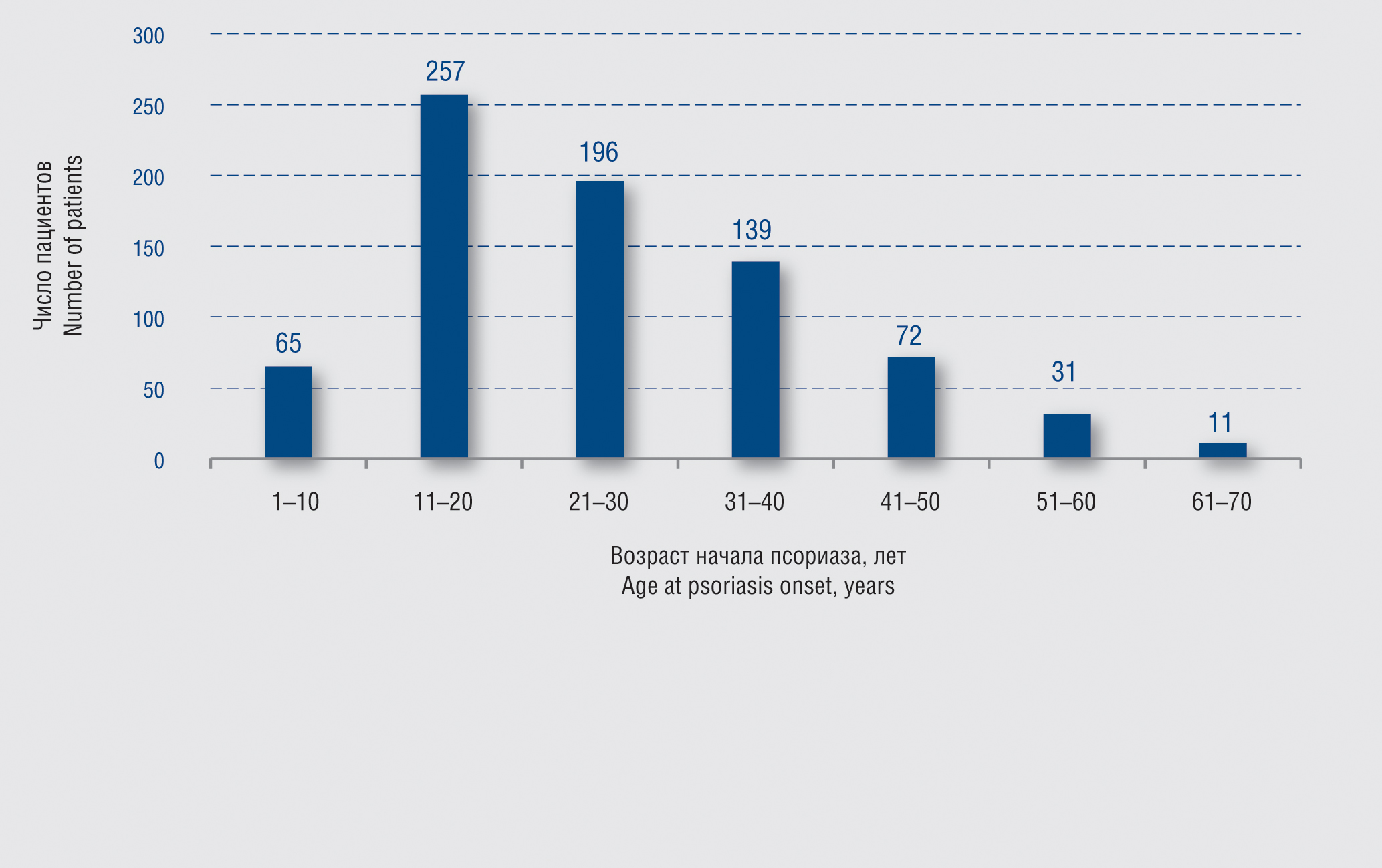Рис. 1. Распределение числа пациентов (n = 771) по возрасту начала псориаза / Fig. 1. Patient distribution (n = 771) by age at psoriasis onset