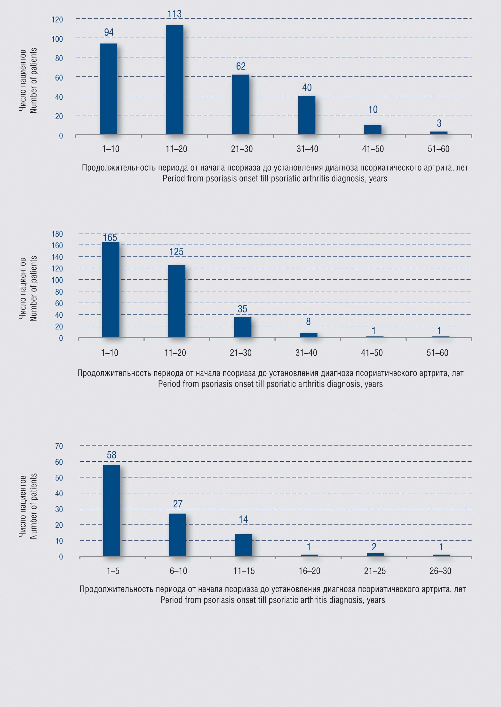 Продолжительность периода времени от начала псориаза до установления диагноза псориатического артрита в среднем составляла 13,7 ± 10,3 года, ее медиана [межквартильный интервал] — 12 [6–19] лет.