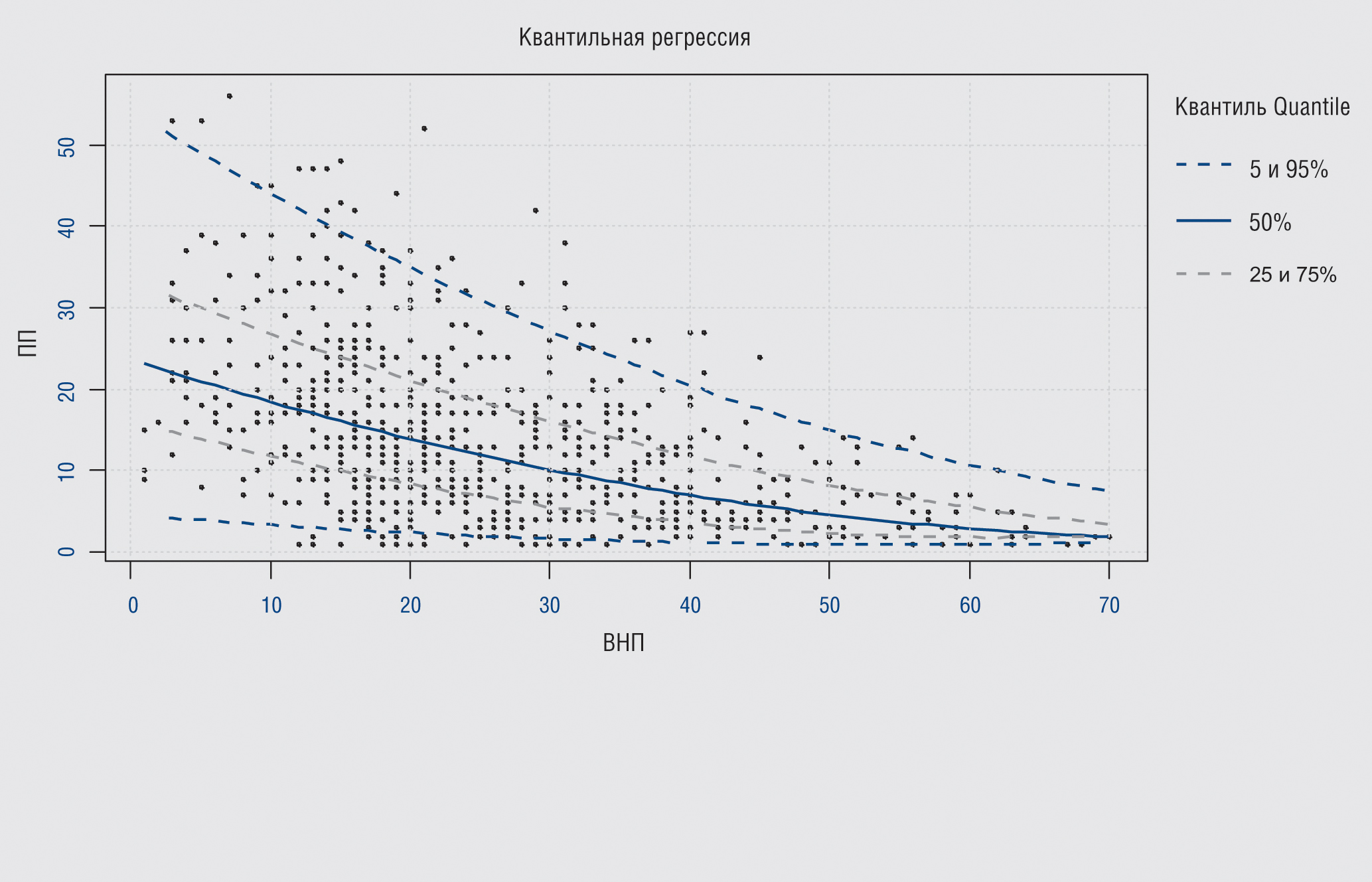 Полученные линии квантилей могут быть описаны следующим уравнением: