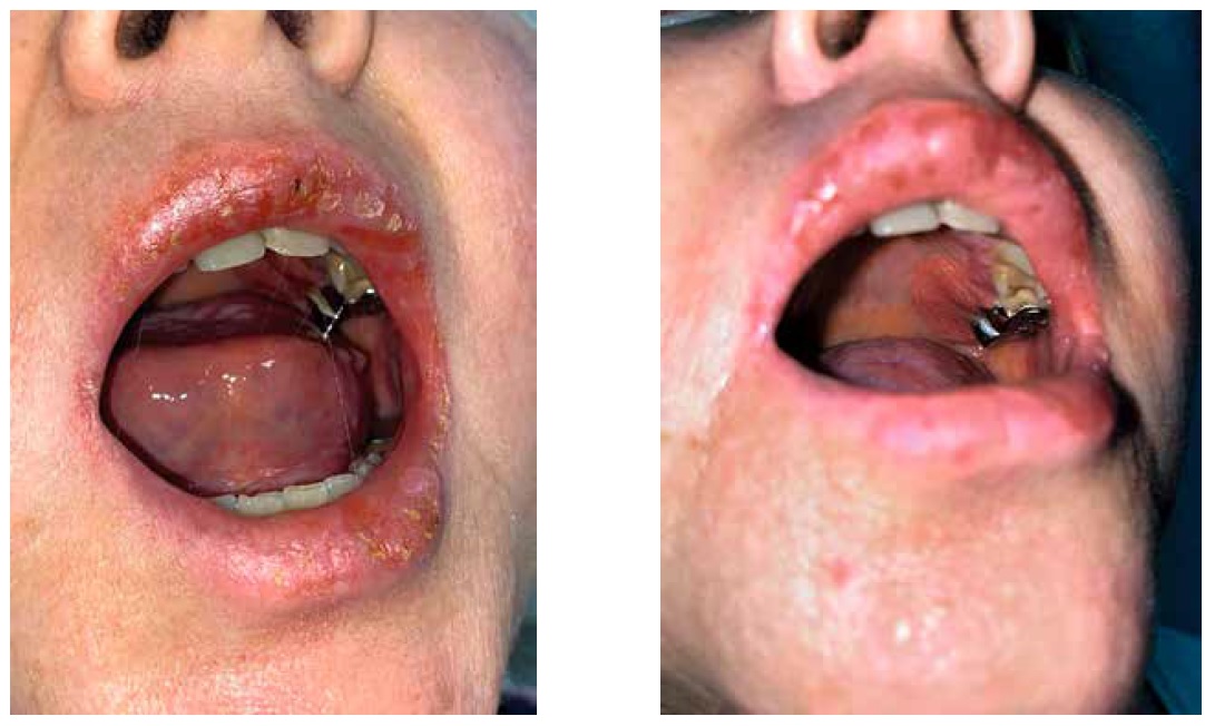 Из анамнеза известно, что пациентка болеет с 2004 г., когда впервые отметила «покраснение» в области гениталий, в связи с чем обратилась в БУЗ ВО «ГКБ № 7» г. Воронежа (по месту жительства), где был установлен диагноз: вульвовагинит. Неоднократно проводилось амбулаторное лечение у гинеколога (указать препараты затрудняется) с временным положительным эффектом. Летом 2009 г. был поставлен диагноз крауроз вульвы, в связи с чем получала курсы лечения (вагинальные свечи) с незначительным эффектом. В начале 2011 г. наряду с поражением области гениталий пациентка отметила появление высыпаний на слизистой оболочке полости рта, по поводу которых в августе 2011 г. госпитализирована в ФГБУ «НМИЦ АГП им. В.И. Кулакова» в отделение гинекологической эндокринологии, где был поставлен диагноз: красный плоский лишай вульвы и ротовой полости, эрозивно-язвенная форма. Выполнено гистологическое исследование биоптата вульвы. Заключение: биоптат вульвы представлен соединительной тканью с интенсивной лимфоидно-гистиоцитарной инфильтрацией, эпителиальный компонент отсутствует. Проведено лечение эстрогенными препаратами (овестин), топическими глюкокортикостероидными средствами (дермовейт) с кратковременным эффектом. В декабре 2015 г., в связи с увеличением количества высыпаний в полости рта, обратилась на кафедру стоматологии ВГМУ им. Н.Н. Бурденко, где был подтвержден диагноз: красный плоский лишай, эрозивно-язвенная форма и назначено лечение: дексаметазон 2 мг в сутки перорально и плаквенил 200 мг в сутки, которое прервала в связи с непереносимостью препаратов (появление крапивницы). С 2016 по сентябрь 2017 г. находилась под наблюдением гинеколога и дерматовенеролога по месту жительства. Со слов пациентки, в мае 2019 г. впервые отметила нарушение глотания (при приеме таблетки кардиомагнила), дискомфорт при глотании твердой и жидкой пищи сохранялся и на момент поступления в стационар ГНЦДК. С 2020 г. отмечала усиление болезненности и дискомфорта в полости рта и гениталий, в связи с чем в мае 2020 г. находилась на стационарном лечении в БУЗ ВО «ВОКБ № 1» с диагнозом: склероатрофический лихен, где проводилось лечение без выраженного эффекта. В июне 2021 г. пациентка была консультирована врачом-онкологом по месту жительства, где на основании данных осмотра был поставлен диагноз: доброкачественное новообразование других неуточненных частей рта (D10.3). Лечение не проводилось. В августе 2021 г. консультирована врачом-ревматологом в Центре ревматологии БУЗ ВО «ВОКБ № 1», где на основании жалоб и физикального обследования был поставлен диагноз: болезнь Бехчета? и проведено следующее дообследование: (dsDNA — отр.; NUC (к нуклеосомам) — отр.; SS-A — отр.; SS-B — отр.; RNP/Sm — отр.; Scl 70 — отр.; Jo 1 — отр.; CENP-B — отр.; антитела к ДНК нативной — 4,3 МЕ/мд; антитела к ДНК денатурированной — 3,77 МЕ/мл; С-реактивный белок 16,5 мг/л; антинуклеарный фактор — < 1:160). В сентябре 2021 г. решением врачебной комиссии БУЗ ВО «ВОКБ № 1» пациентка была направлена на консультацию в ФГБУ «ГНЦДК» Минздрава России с целью верификации диагноза и решения вопроса о дальнейшей тактике ведения, куда и была госпитализирована 30.09.2021.