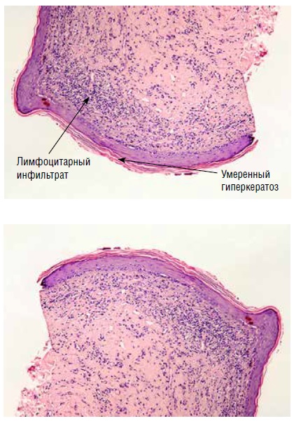 Рис. 3. Гистологическое исследование биоптата с вульвы. Лимфоцитарный инфильтрат, умеренный гиперкератоз / Fig. 3. Histological examination of a biopsy from the vulva. Lymphocytic infiltrate, moderate hyperkeratosis