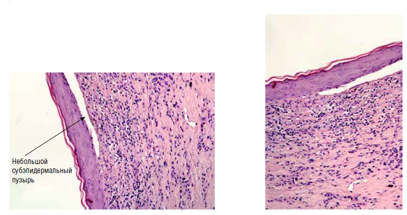 Рис. 4. Гистологическое исследование биоптата с вульвы. Небольшой субэпидермальный пузырь / Fig. 4. examination of a biopsy from the vulva. Small subepidermal bladder