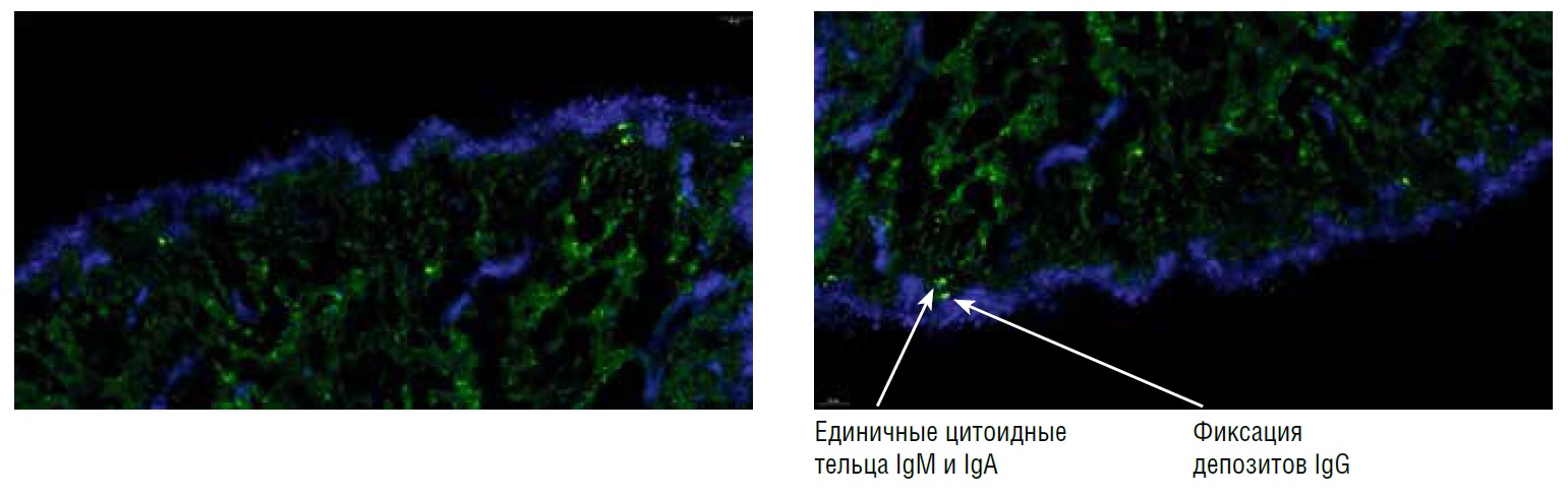В результате исследования биоптата кожи, полученного на участке видимо непораженной кожи, методом непрямой иммунофлюоресценции с антителами к IgG, IgA, IgM выявлена выраженная размытая фиксация депозитов IgG во всех слоях эпидермиса по контуру мембран кератиноцитов без формирования «сетки». На границе сосочкового и сетчатого слоев дермы отмечается фиксация единичных цитоидных телец IgM и IgА (соответствует неспецифической воспалительной реакции). Выявленные иммунофлюоресцентные признаки выражены слабо, преобладают признаки неспецифической воспалительной реакции (могут наблюдаться при поверхностных (интерфейс) дерматитах, в том числе при красном плоском лишае). Достоверных признаков буллезных дерматозов не обнаружено (рис. 5).