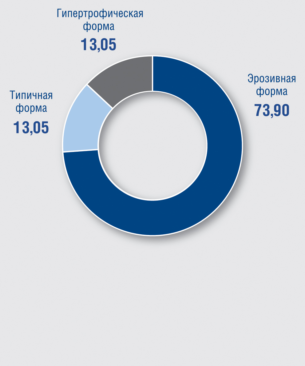 В структуре заболеваемости КПЛ вульвы доминировала эрозивная форма заболевания, которая была диагностирована в 73,9% случаев (рис. 1). Типичная и гипертрофическая формы дерматоза встречались значительно реже, в 13,0% случаев каждая. Возраст обследуемых варьировал от 25 лет до 81 года (в среднем составил 53,1 ± 0,3 года), а длительность заболевания от 1 до 240 месяцев (75,0 ± 2,2 месяца). Наблюдаемые с гипертрофическим КПЛ были несколько старше (61,3 ± 2,3 года), и заболевание у них имело тенденцию к более продолжительному течению (107,3 ± 14,2 месяца), однако значимых различий в возрасте и длительности заболевания среди пациенток с разными клиническими разновидностями КПЛ обнаружено не было.