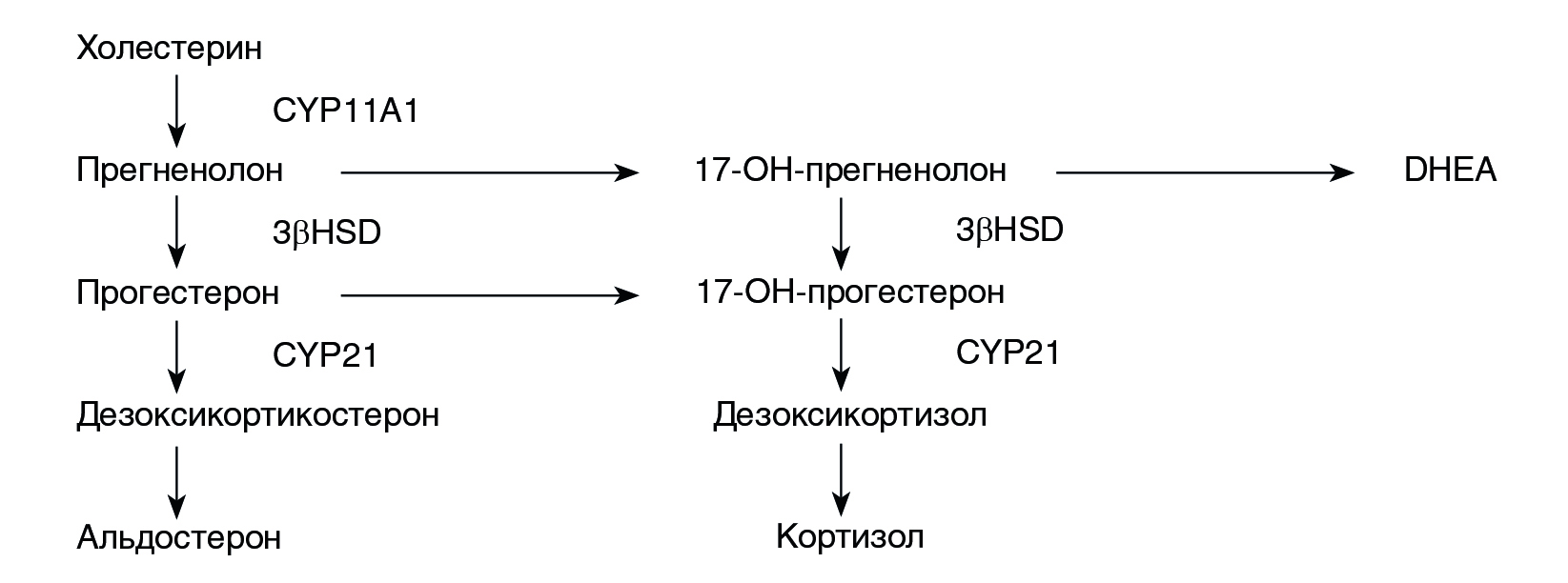 Рис. 1. Схема стероидогенеза. DHEA — дегидроэпиандростерон, CYP11A1 — цитохром P450scc, 3βHSD — 3β-гидроксистероид дегидрогеназа, CYP21 — 21-гидроксилаза