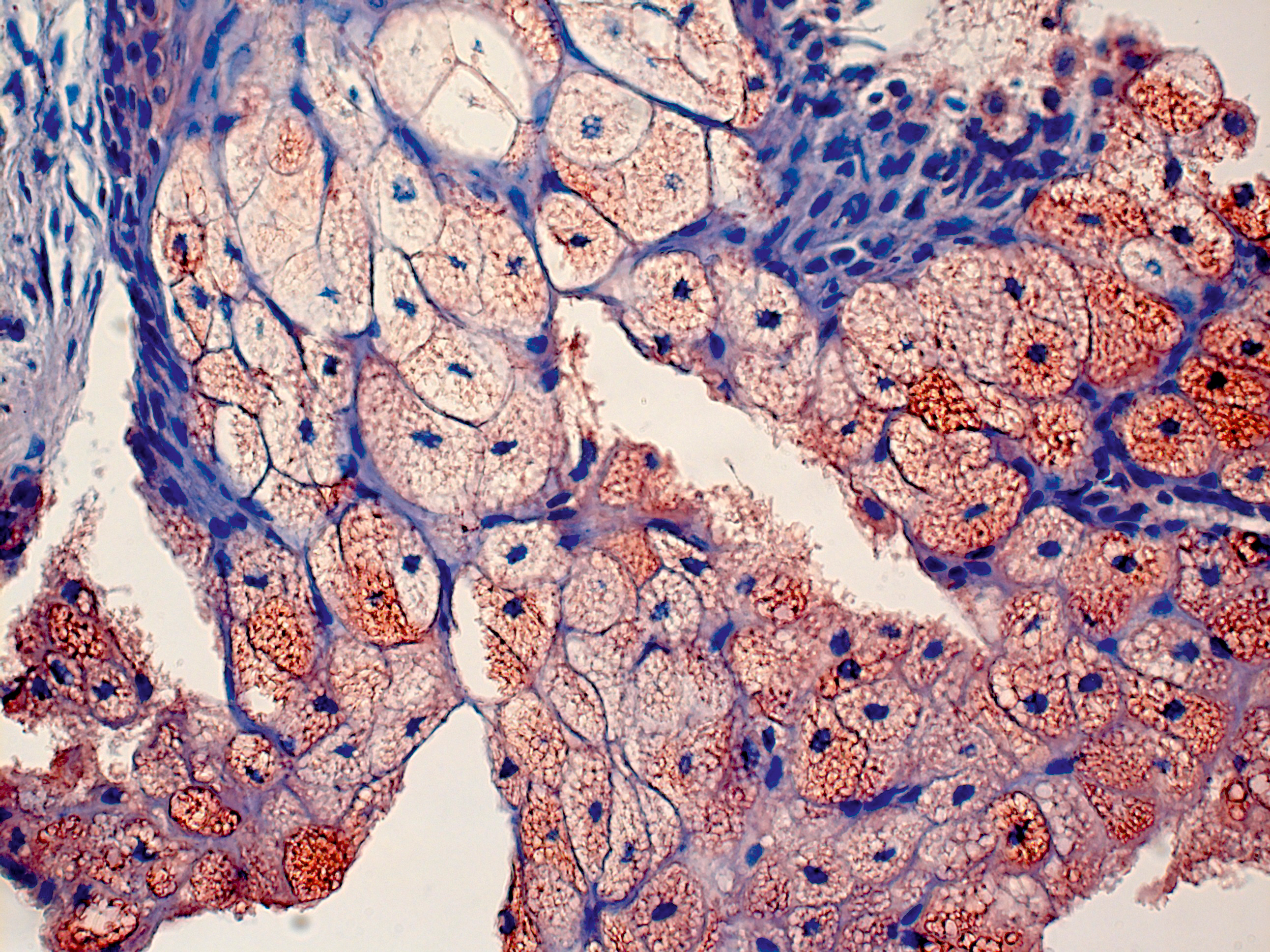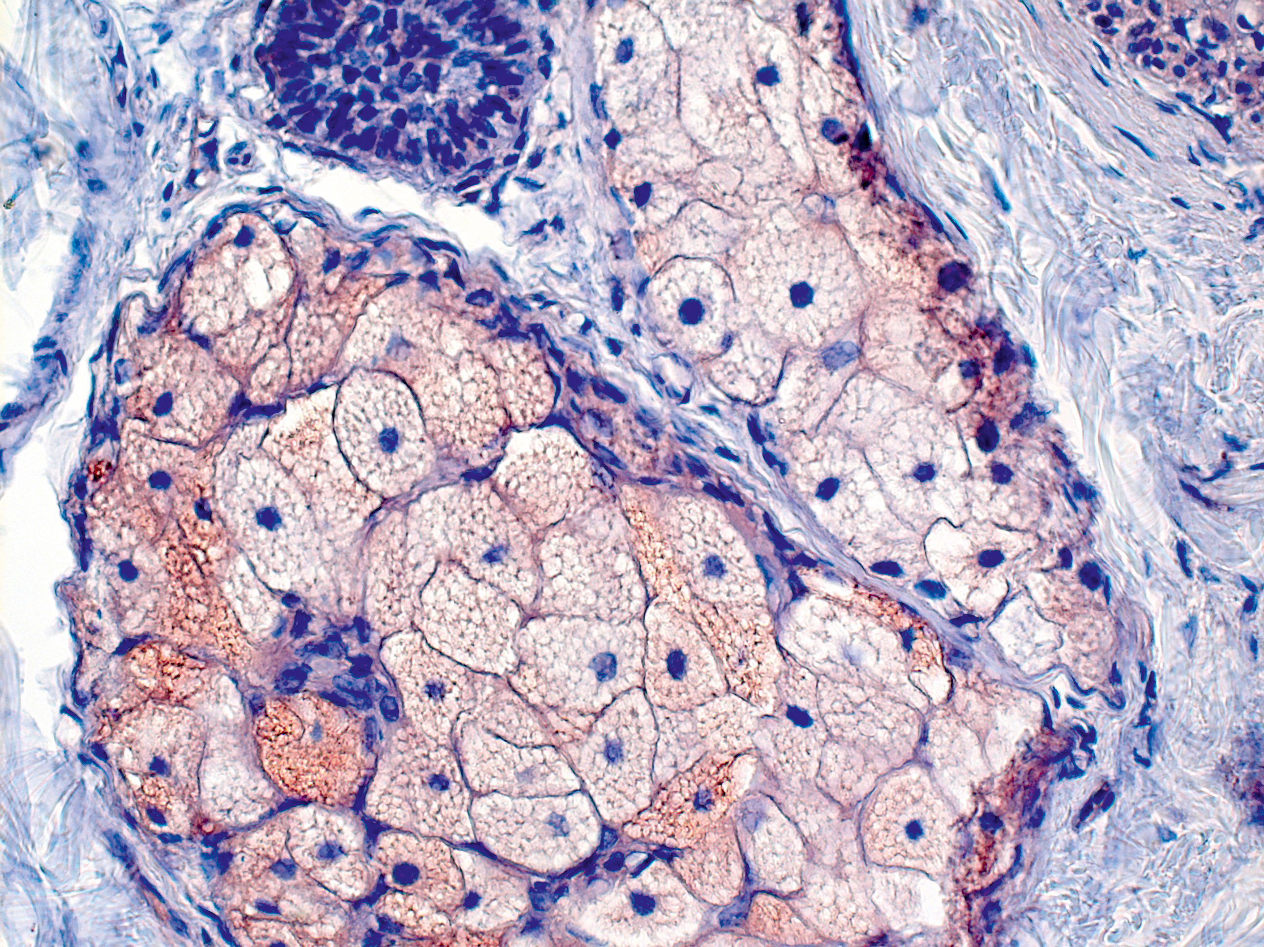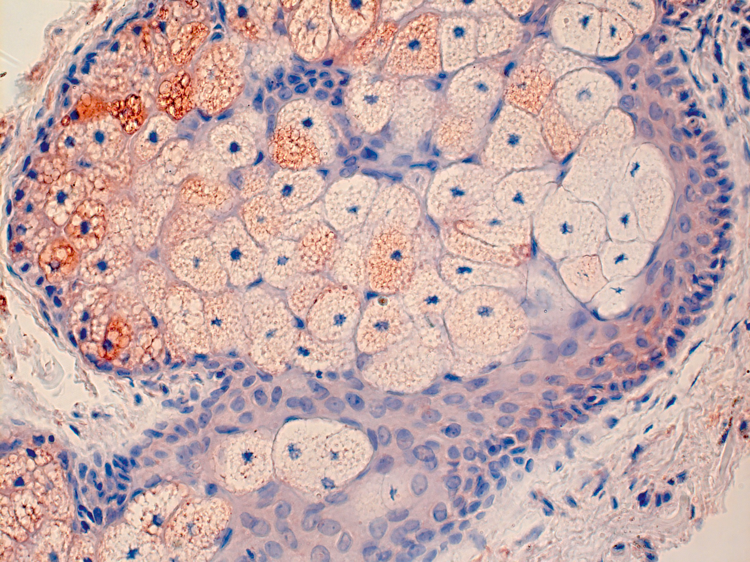 Рис. 6. Сальная железа пациента acne vulgaris: наличие клеток цитохрома CYP11A1+ в зрелых себоцитах, ×400