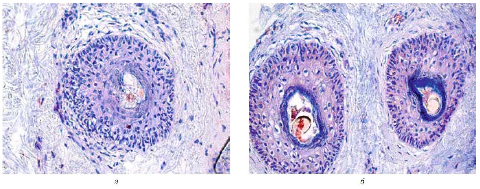 Препараты анализировали с помощью микроскопа Olympus BX-41 при увеличении x600. Количество положительно иммуноокрашенных клеток определяли на 100 эпидермальных кератиноцитов или себоцитов. В положительных образцах окрашивание дополнительно классифицировалось как сильное (+++), умеренное (++) или слабое (+) с использованием иммуногистохимического (ИГХ) индекса, рассчитанного как процент (+++) клеток • 3 + (++) клеток • 2 + (+) клеток • 1 [19]. Оценка осуществлялась двумя специалистами на основе анализа полученных цифровых изображений. Цифровые изображения были получены с помощью камеры Infinity (Lumenera Corporation, Канада) и проанализированы с использованием коммерческого программного обеспечения Infinity Capture, Infinity Analyze (V.4.6.0).