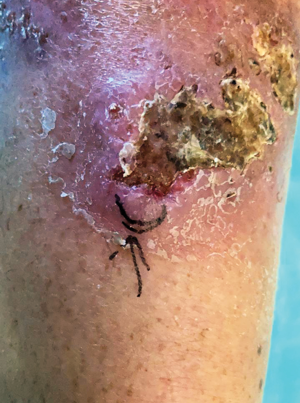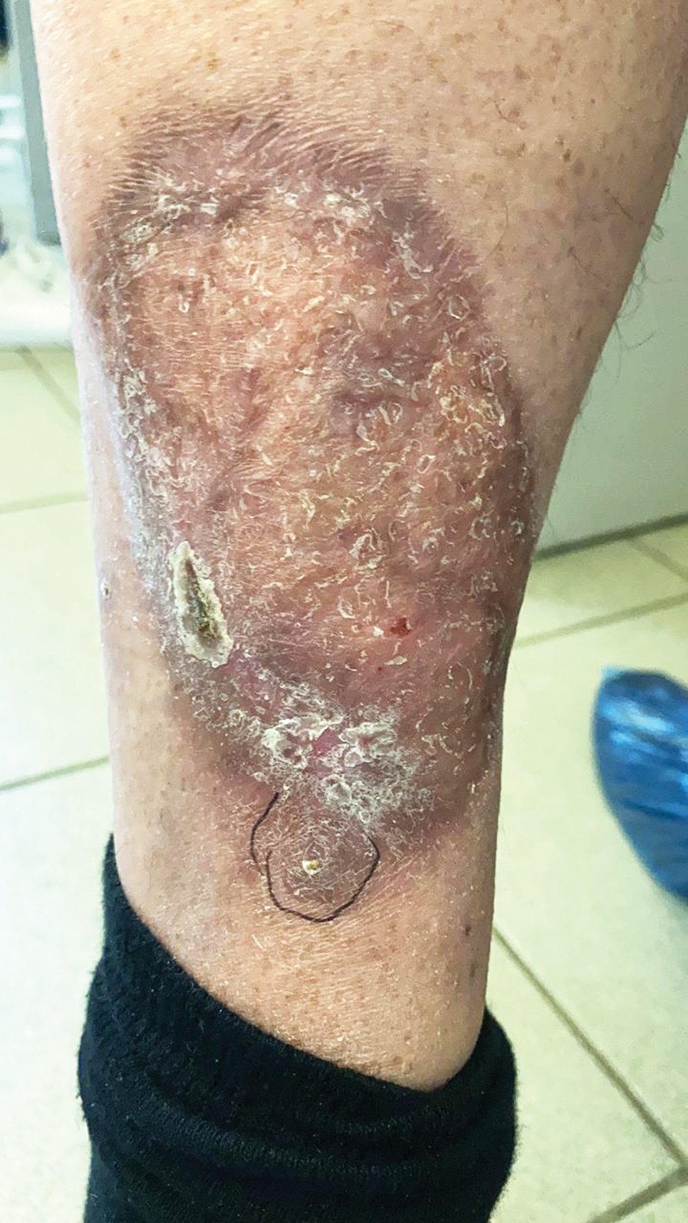 Рис. 4. Очаг на левой голени, указано место биопсии (май 2021 г.)