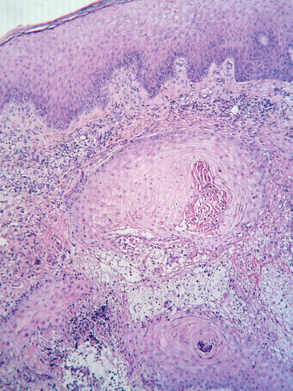 Рис. 2. Гистологический препарат левой голени (сентябрь 2020 г.). Окраска гематоксилином и эозином; ×100. В дерме определяются дискератотические эпидермальные тяжи. Морфологическая картина соответствует умеренно дифференцированному плоскоклеточному раку