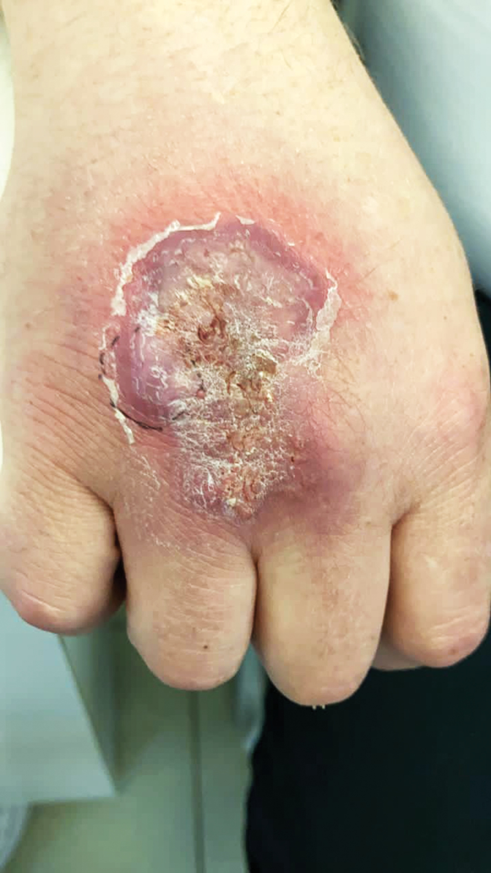 Fig. 3. A lesion on the dorsum of the right hand; the biopsy site is indicated (May 2021)