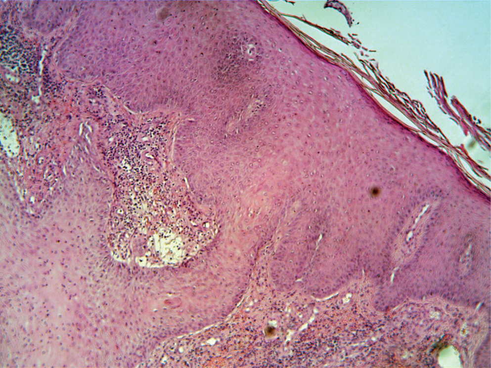 Рис. 5. Гистологический препарат (май 2021 г.). Правая кисть (окраска гематоксилином и эозином; ×100). Гиперкератоз, выраженный акантоз, псведоэпителиоматозная гиперплазия эпидермиса. В верхней части дермы сосуды расширены, диффузно-очаговые инфильтраты их лимфоцитов, гистиоцитов, эозинофилов, плазмоцитов и нейтрофилов