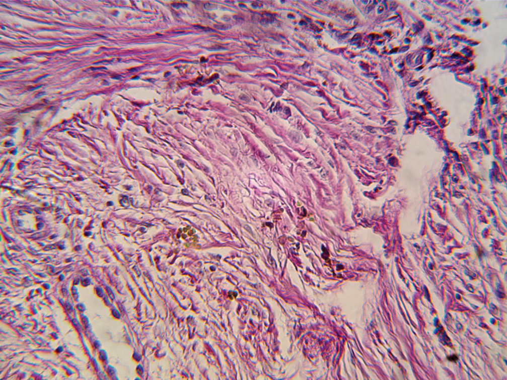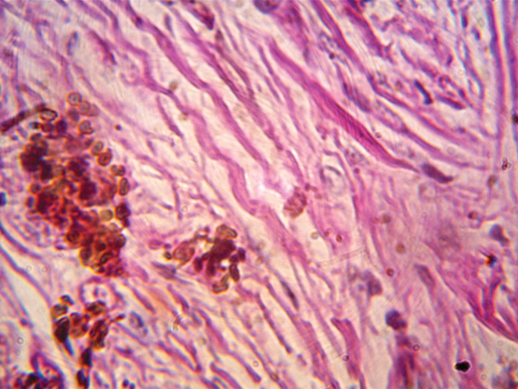 Fig. 7. Histological specimen (May 2021). Skin of the left lower leg (PAS stain; 400×). Olive brown rounded and filamentous inclusions are detected in the dermis. The revealed changes correspond to chromomycosis