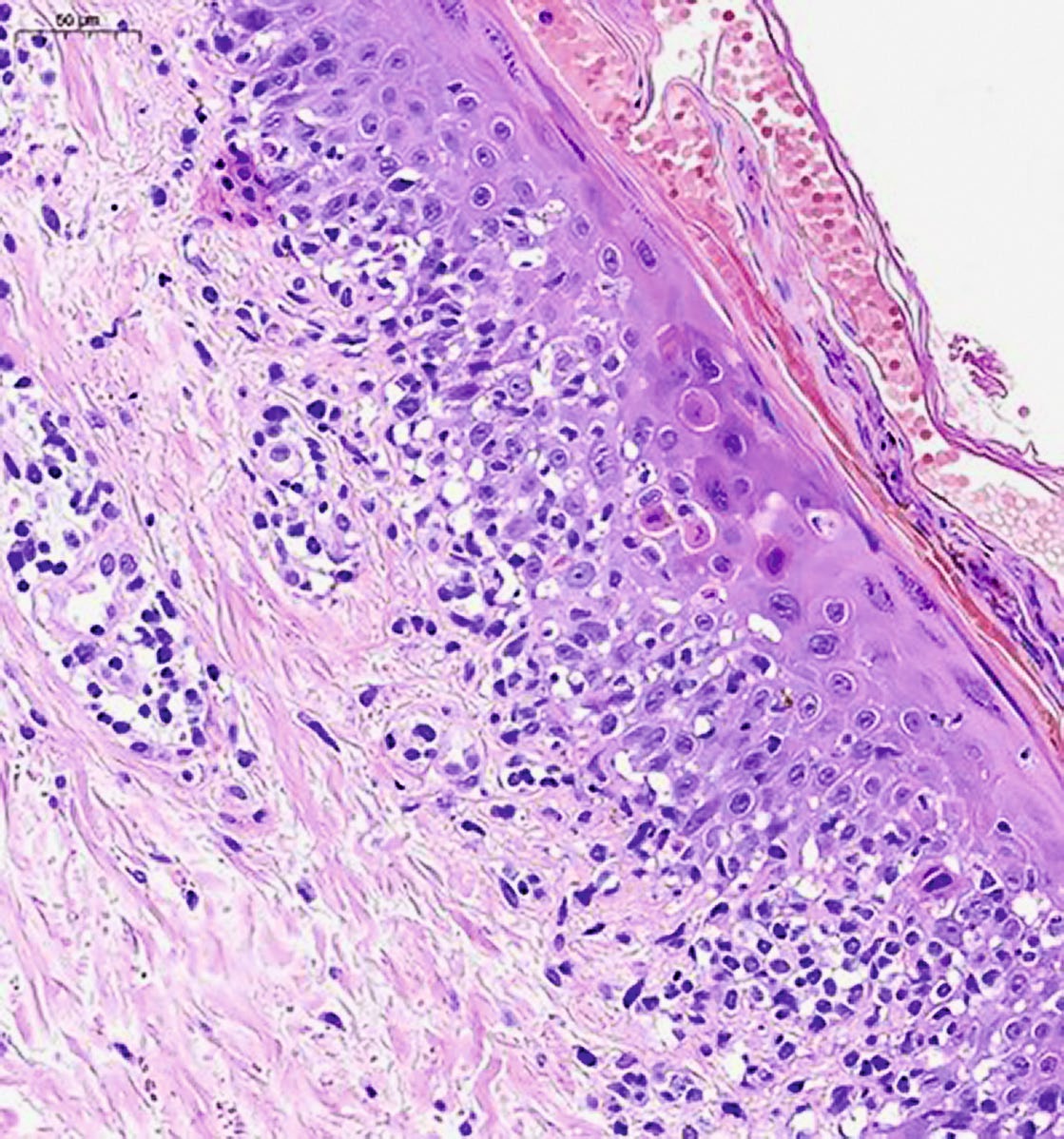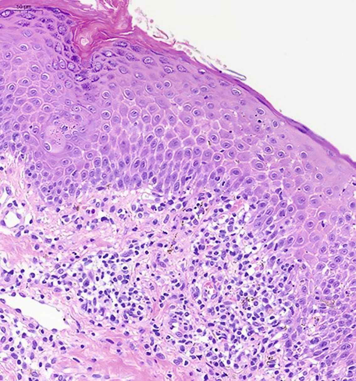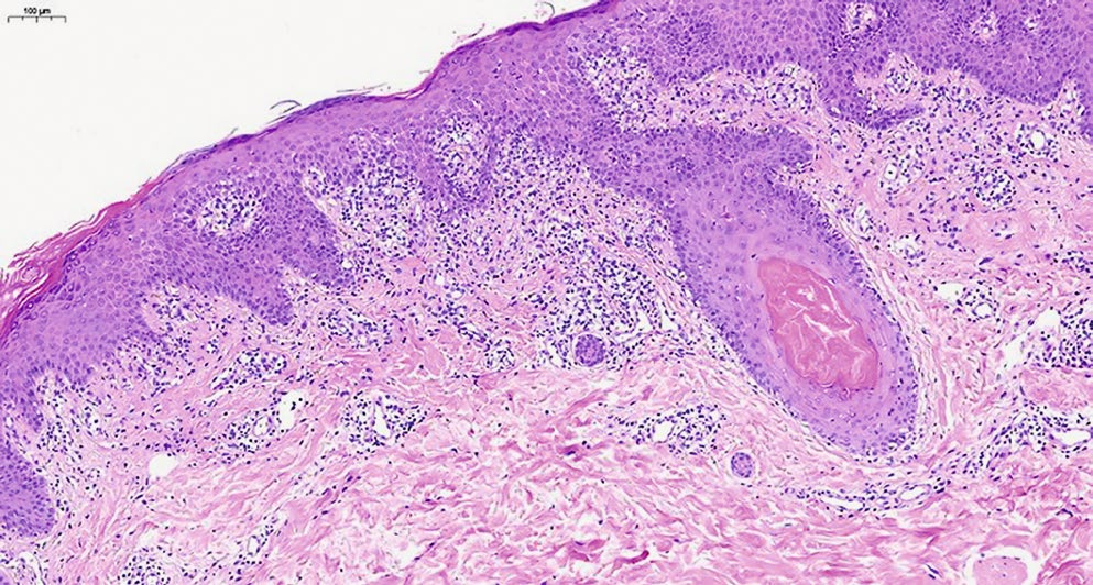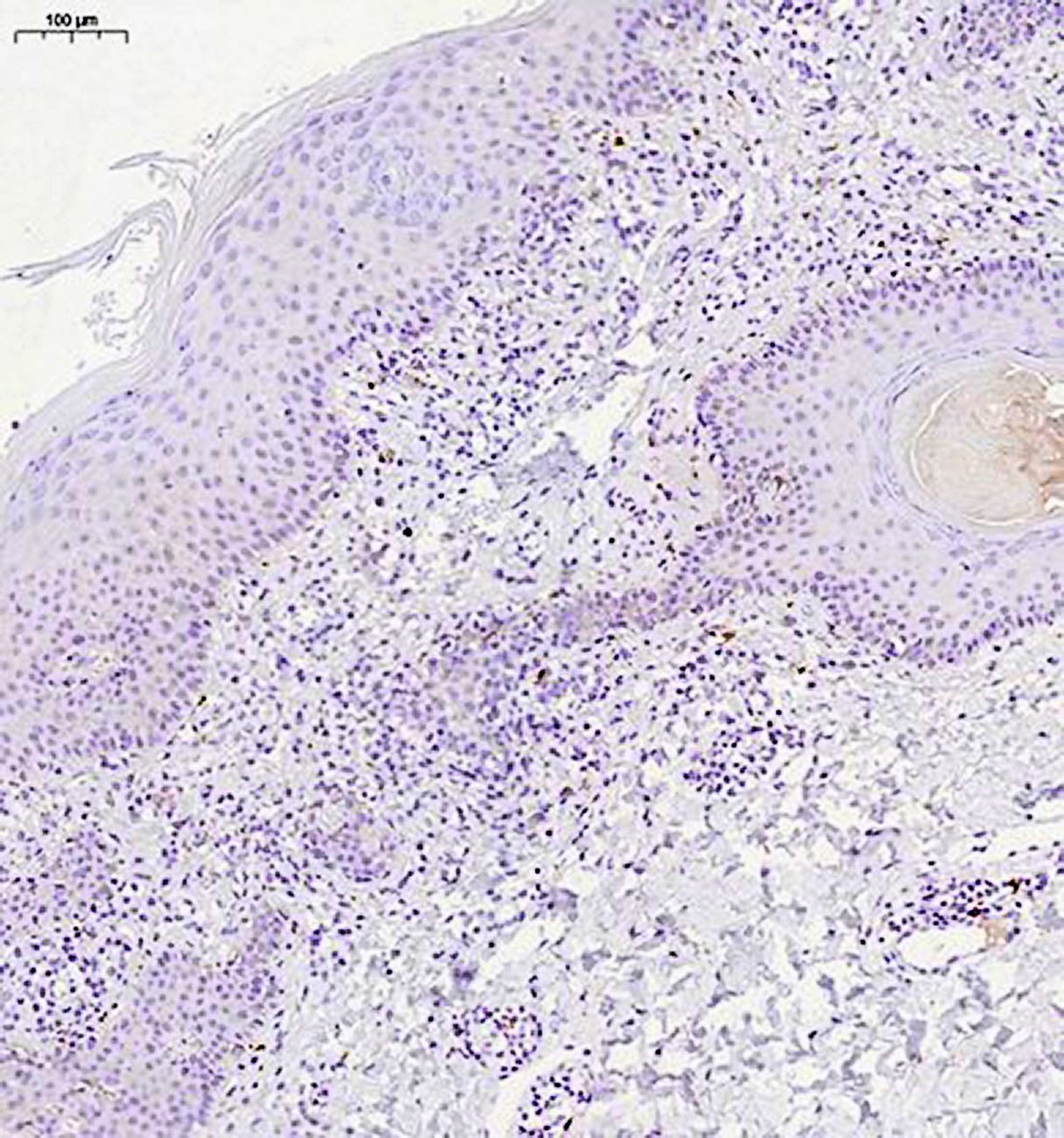 При гистологическом исследовании фрагмента кожи с окраской гематоксилином и эозином выявлен эпидермис с нерегулярным слабо выраженным акантозом, признаками чередования участков пара- и ортокератоза, перифолликулярными участками паракератоза, корками на поверхности, фолликулярными кератиновыми пробками (рис. 2). В верхних слоях дермы обнаруживается периваскулярный лимфогистиоцитарный инфильтрат с участками выраженного эпидермотропизма, в проекции которых эпидермис демонстрирует выраженный спонгиоз (рис. 3), признаки вакуольной дистрофии, содержит многочисленные тельца Сиватта (рис. 4). Среди клеток инфильтрата видны мелкие фрагменты коллагеновых волокон. Кровеносные сосуды сосочкового слоя дермы расширены, придатки кожи сохранены.