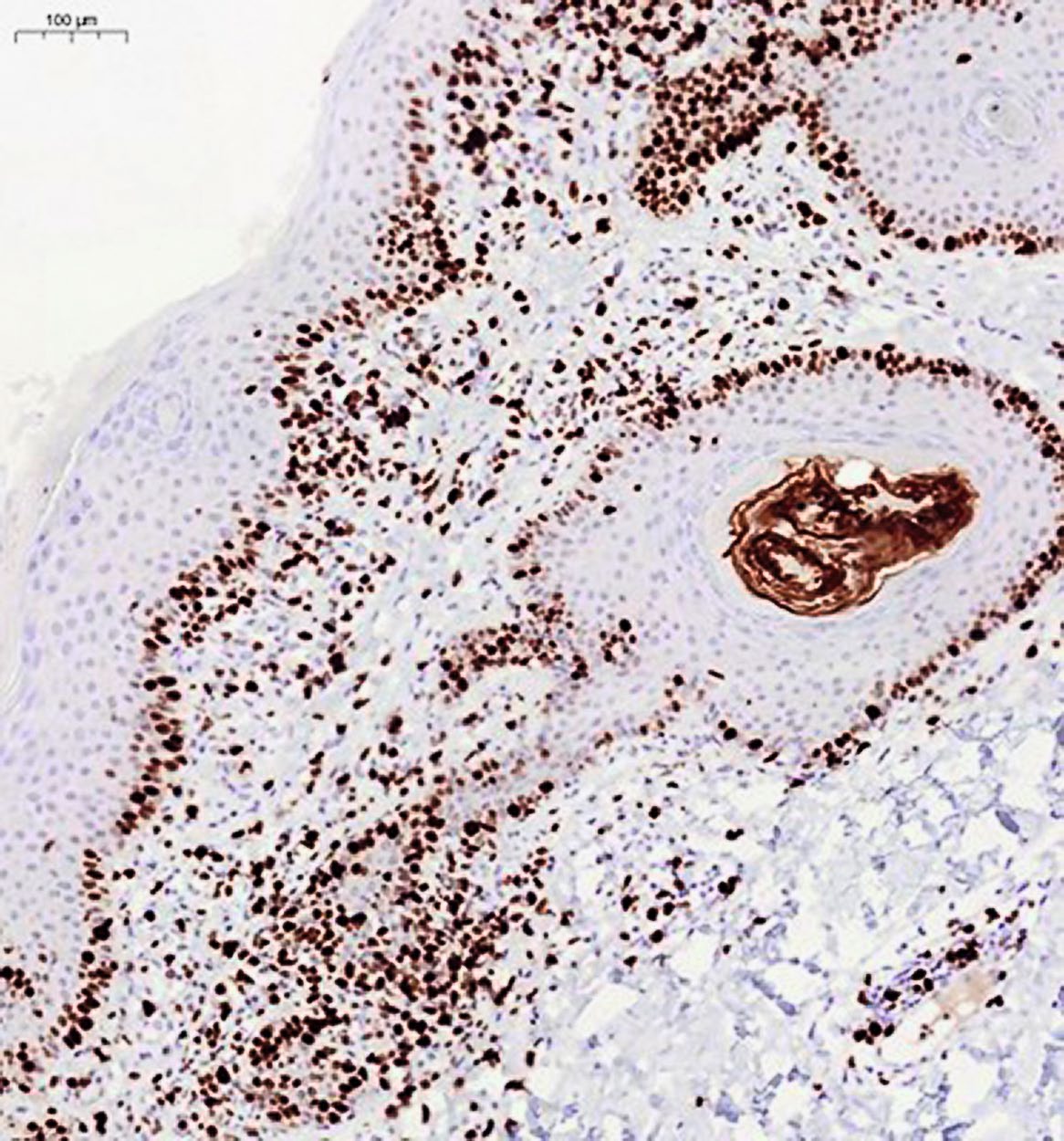 При иммуногистохимическом исследовании антиген пролиферативной активности Ki-67 экспрессирован в ядрах примерно 30% клеток воспалительного инфильтрата, в эпидермисе экспрессия Ki-67 не ограничена клетками базального слоя, а видна в более высоких слоях (рис. 5). Лимфоидные клетки инфильтрата экспрессируют CD3, CD5, соотношения CD4 и CD8 позитивных клеток соответствуют примерно 1:1 (рис. 6, 7). Единичные клетки экспрессируют CD20 (рис. 8). Заключение: клиническая картина заболевания, обнаруженные морфологические изменения в коже и результаты иммуногистохимического исследования в наибольшей степени соответствуют атипичной форме красного волосяного лишая Девержи.