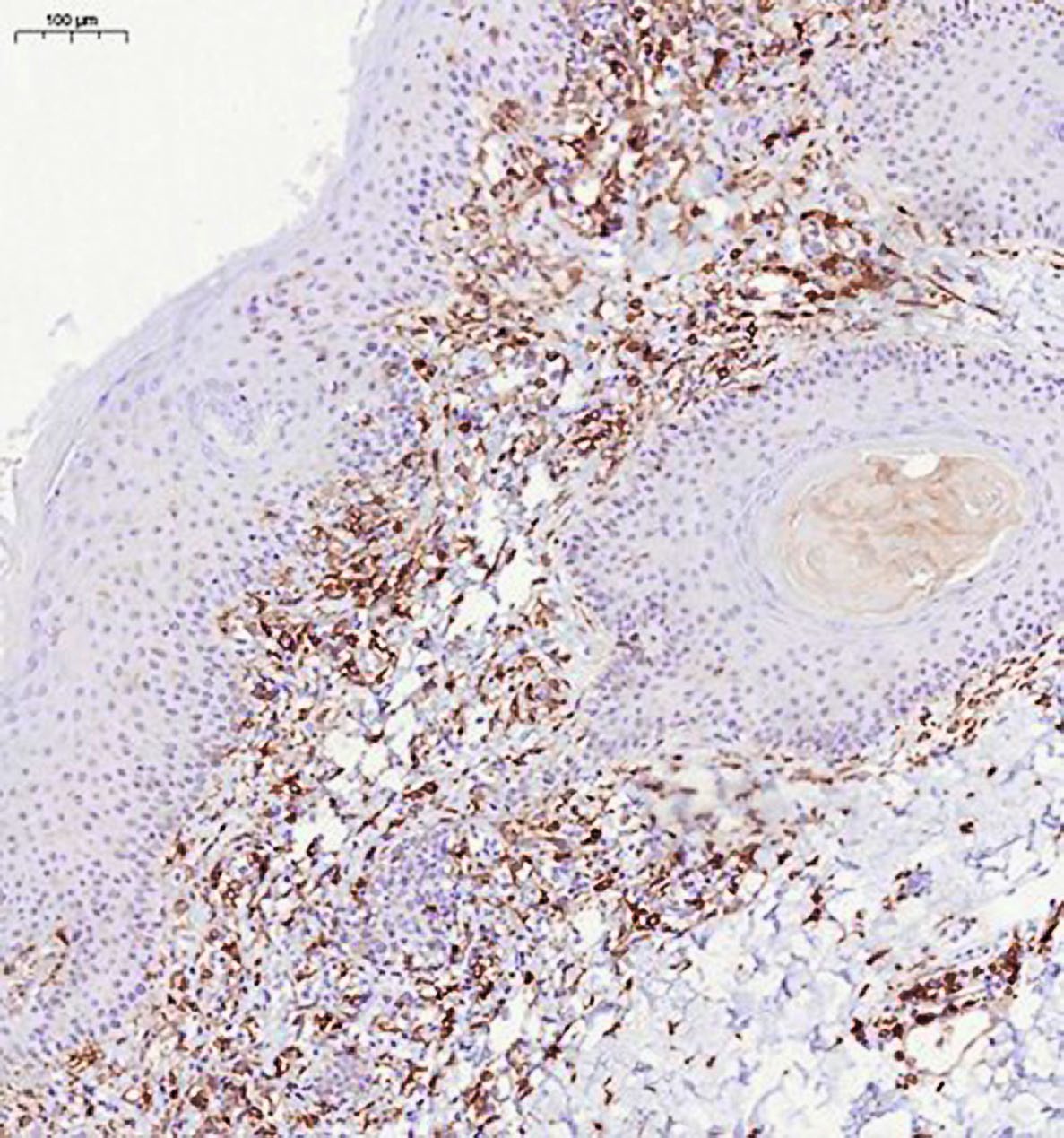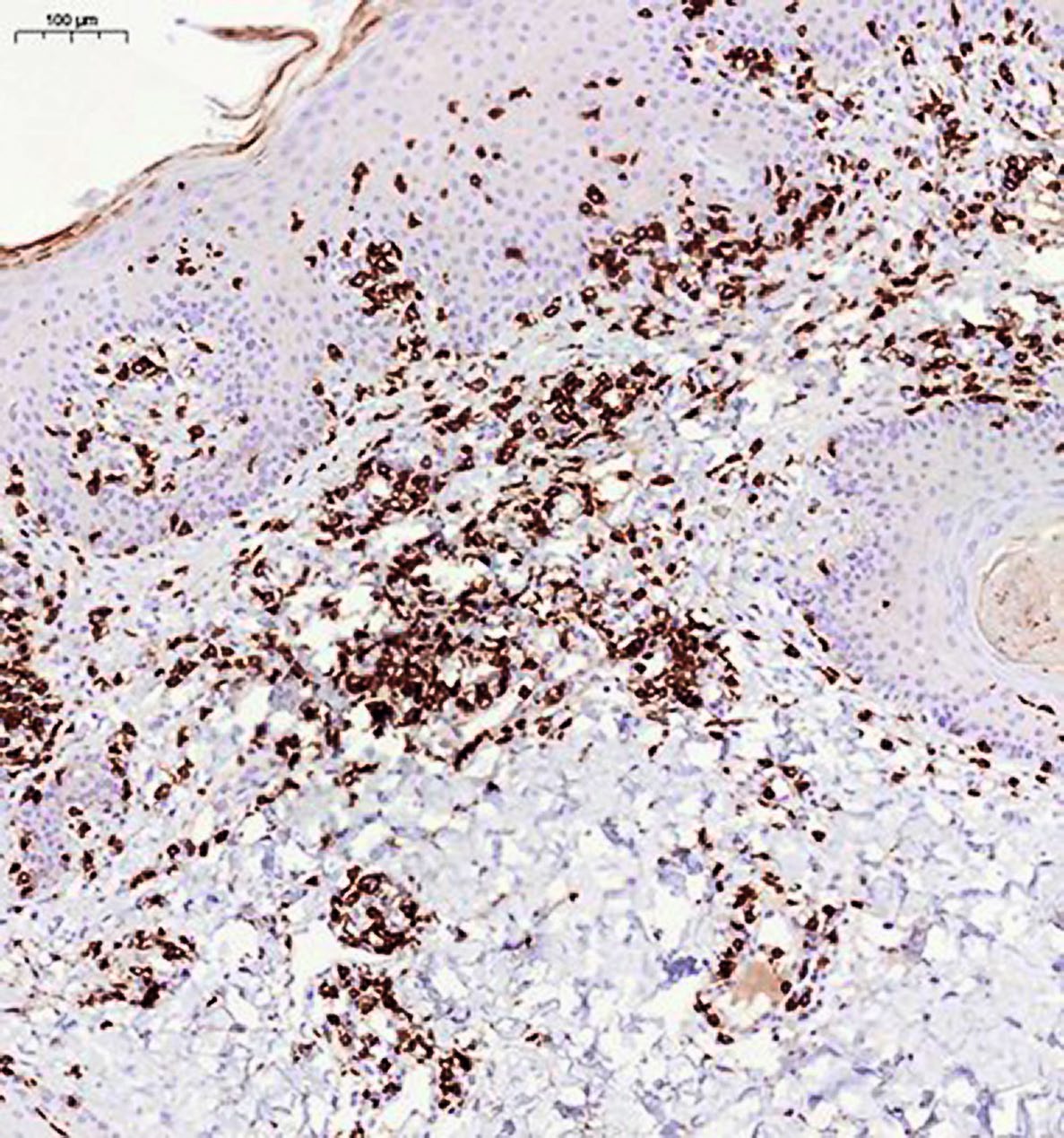 Несмотря на введение высоких доз стероидных противовоспалительных средств (преднизолон 180 мг в сутки), кожные проявления не регрессировали, что позволило исключить их связь с атопическим дерматитом, эритродермической формой псориаза, генерализованной формой крапивницы. С целью дифференциальной диагностики с лимфомой кожи было проведено иммуногистохимическое исследование.