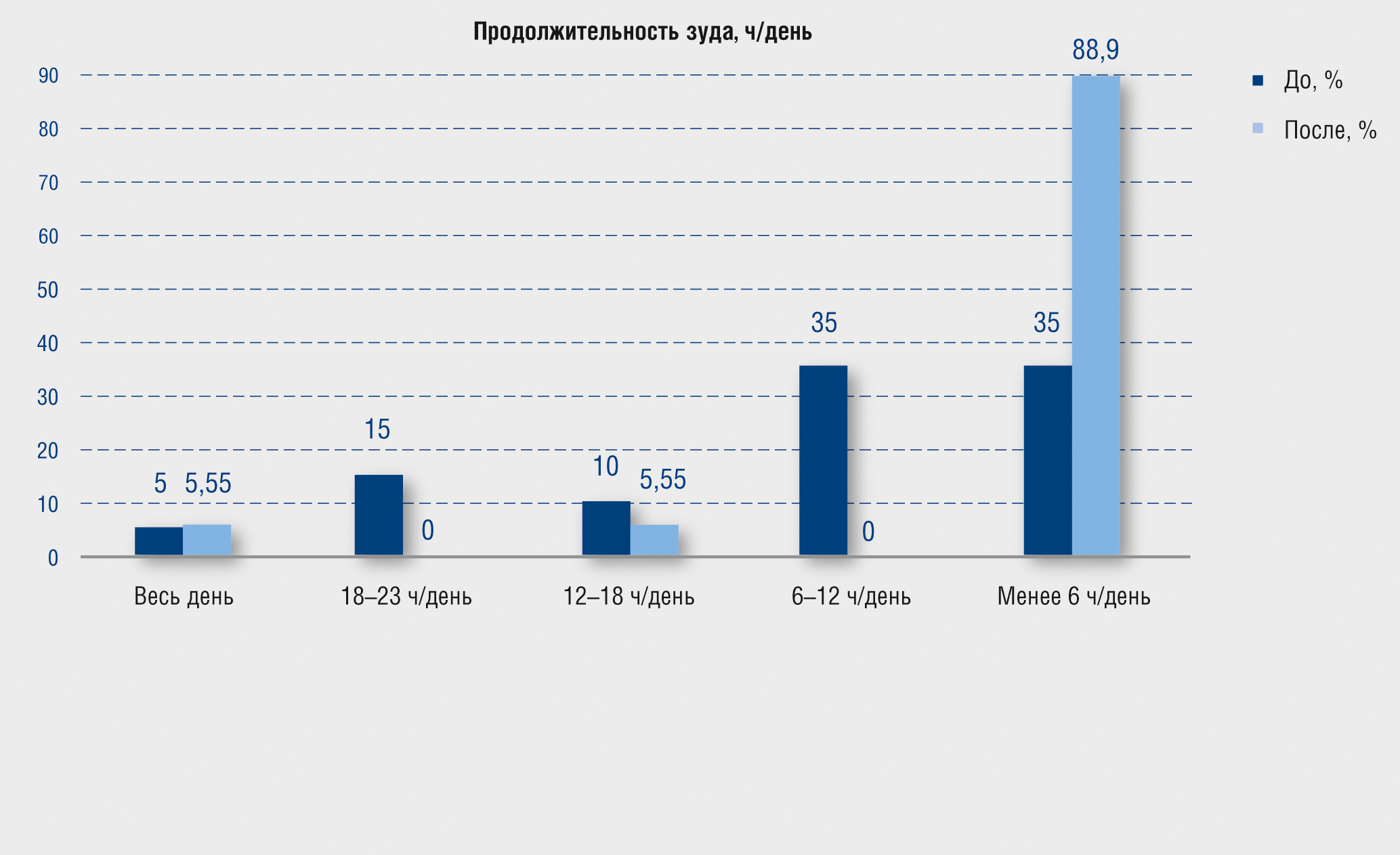 Анализ полученных данных через 21 день показывает уменьшение средних показателей после курса использования эмолентов: симптомы — 18,76 (6,38) (8–24), легкая степень влияния симптомов на качество жизни; эмоции — 15,8 (8,01) (10–28), легкая степень эмоционального вовлечения; функции — 19,4 (8,68) (12–33), легкая степень влияния заболевания на повседневную деятельность. Общее значение — 1,8 (0,77) (0,68–2,72).