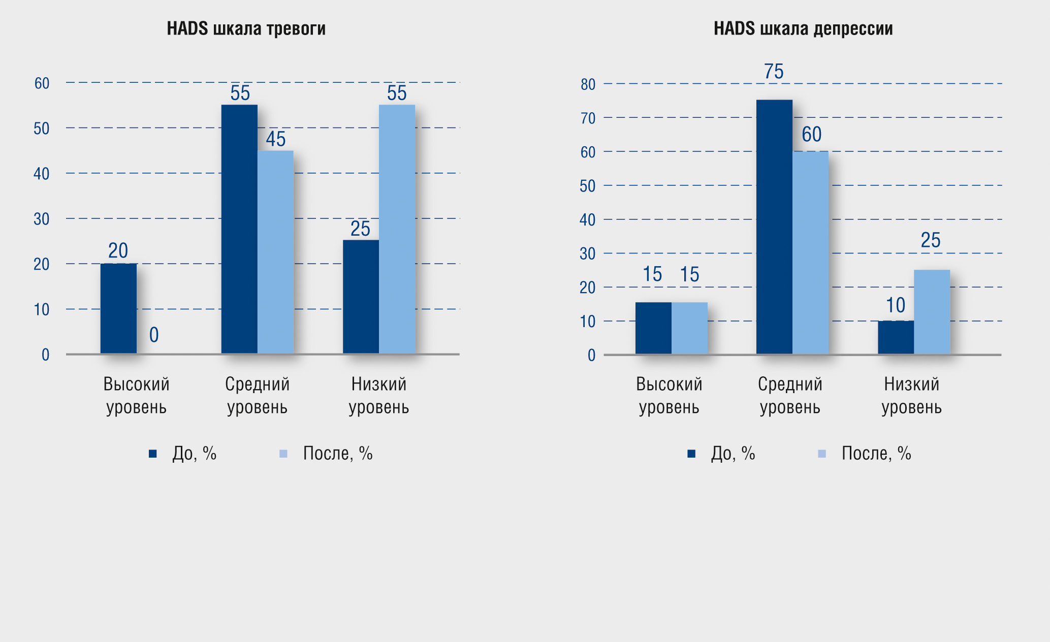 При оценке уровня депрессии 13 (40,62%) улучшили свое состояние, 3 (12,5%) ухудшили, 15 (46,87%) остались без изменения.