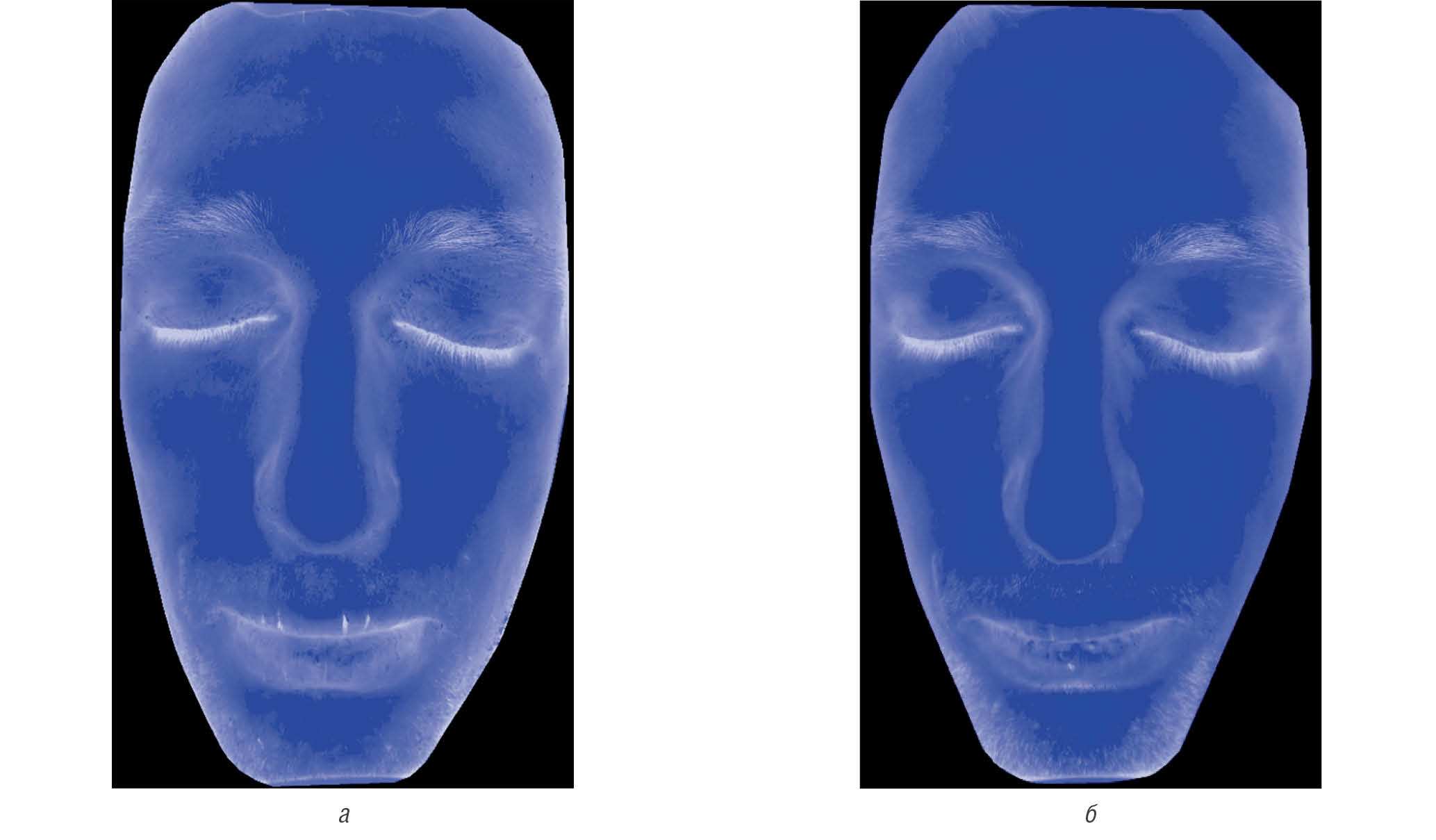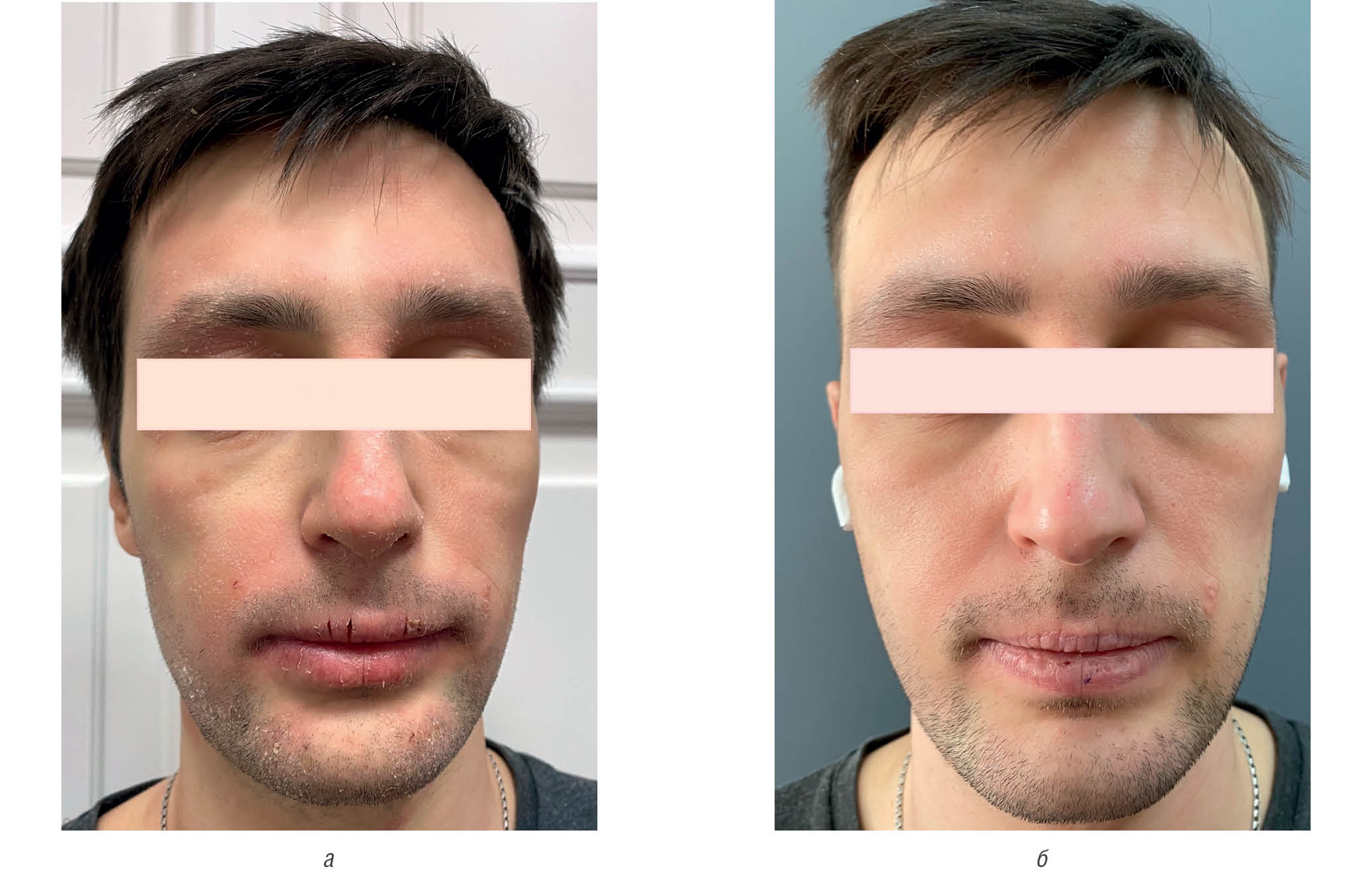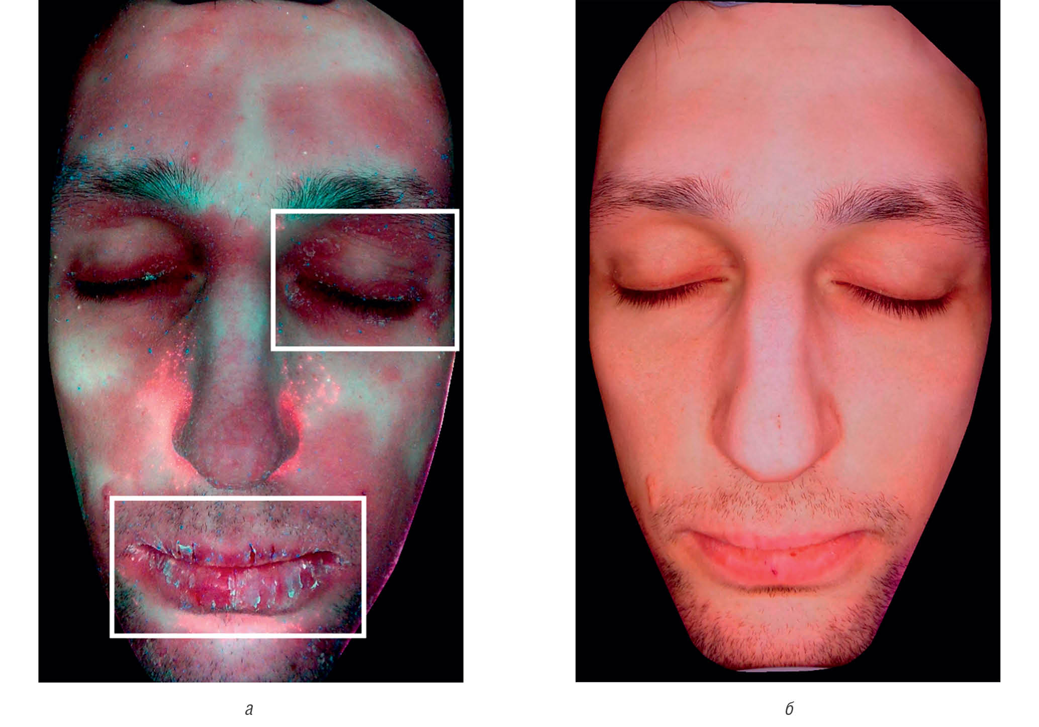 Рис. 12. Пациент П., 27 лет. Визуализация признаков воспаления до применения «Адмеры» (а) и спустя 21 день наблюдения (б). “Facies Atopica”