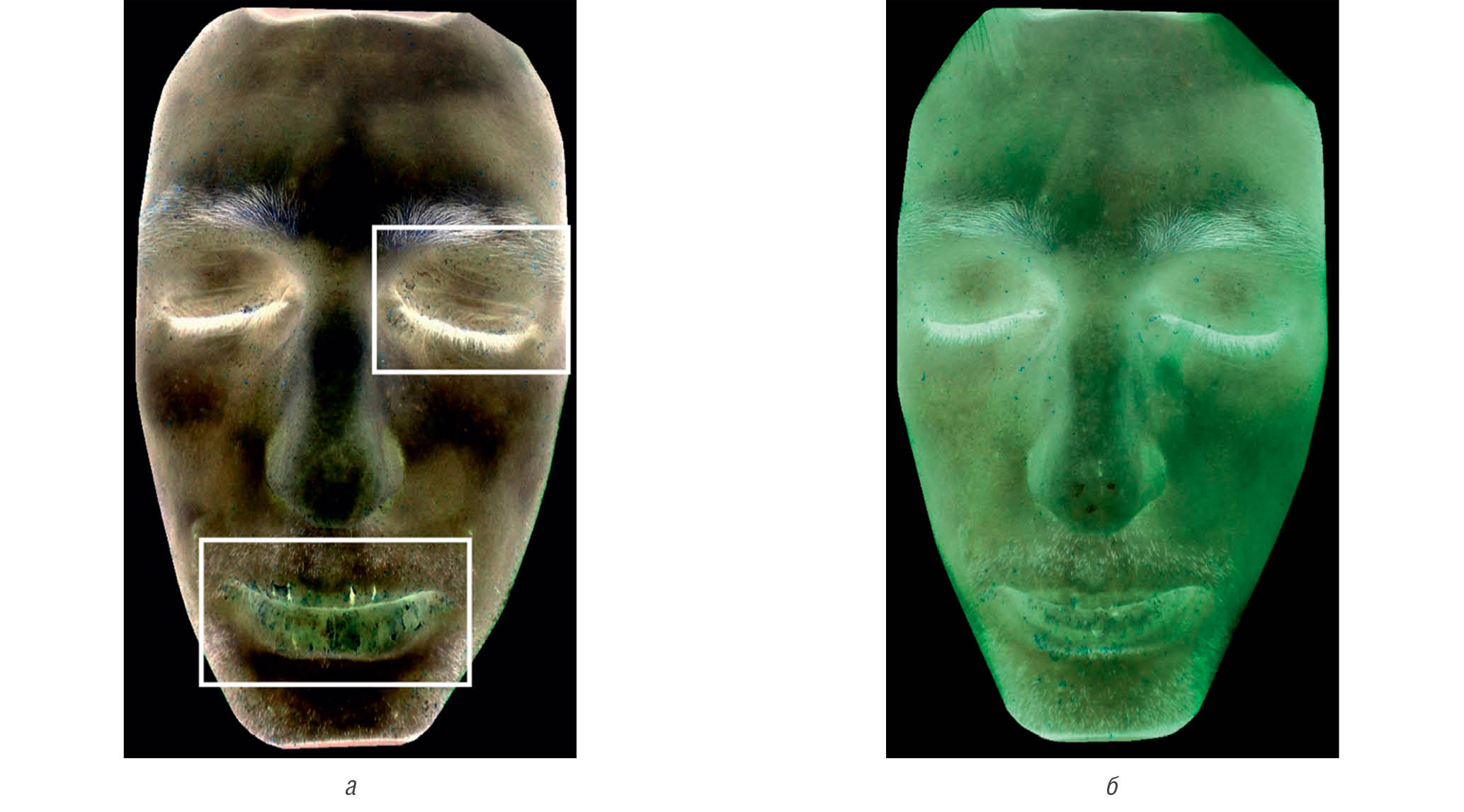 Рис. 13. Пациент П., 27 лет. Визуализация очагов лихенификации в динамике лечения больного АД в УФ свете до применения «Адмеры» (а) и спустя 21 день наблюдения (б). Вывод: степень выраженности лихенификации уменьшилась. “Facies Atopica”