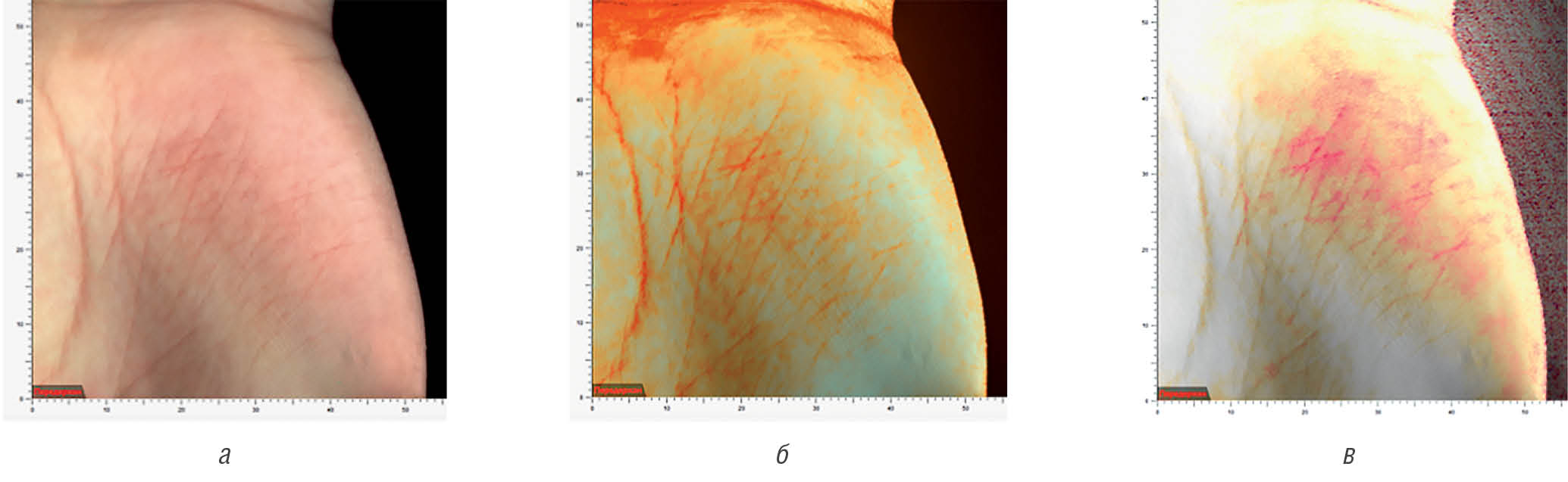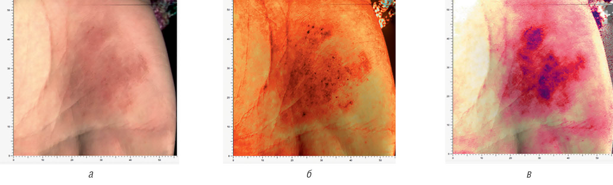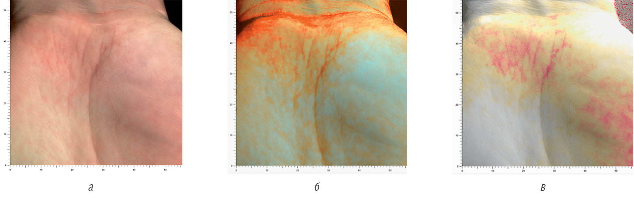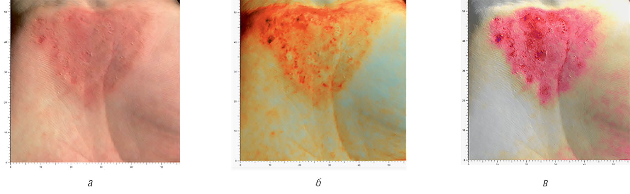 Fig. 15. Antera 3D. Patient M., atopic dermatitis skin lesion of the left palm before starting “Admera” (а–в)