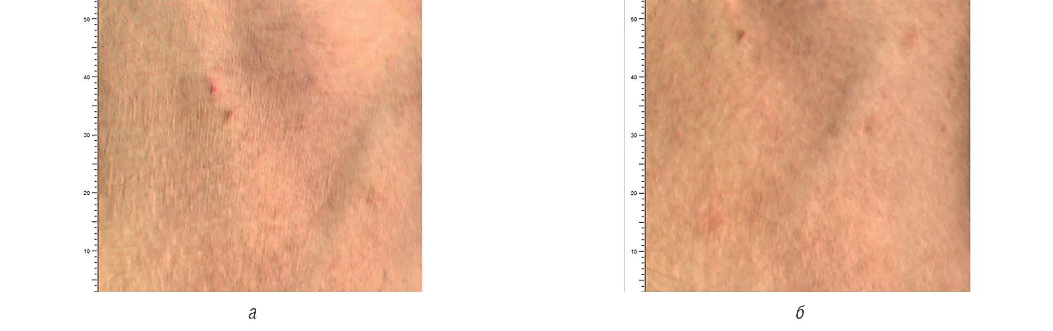Рис. 19. Antera 3D. Пациент Ф., атопический дерматит средней степени тяжести до и после курса нанесения «Адмеры», уменьшение ксероза кожи (а–б)