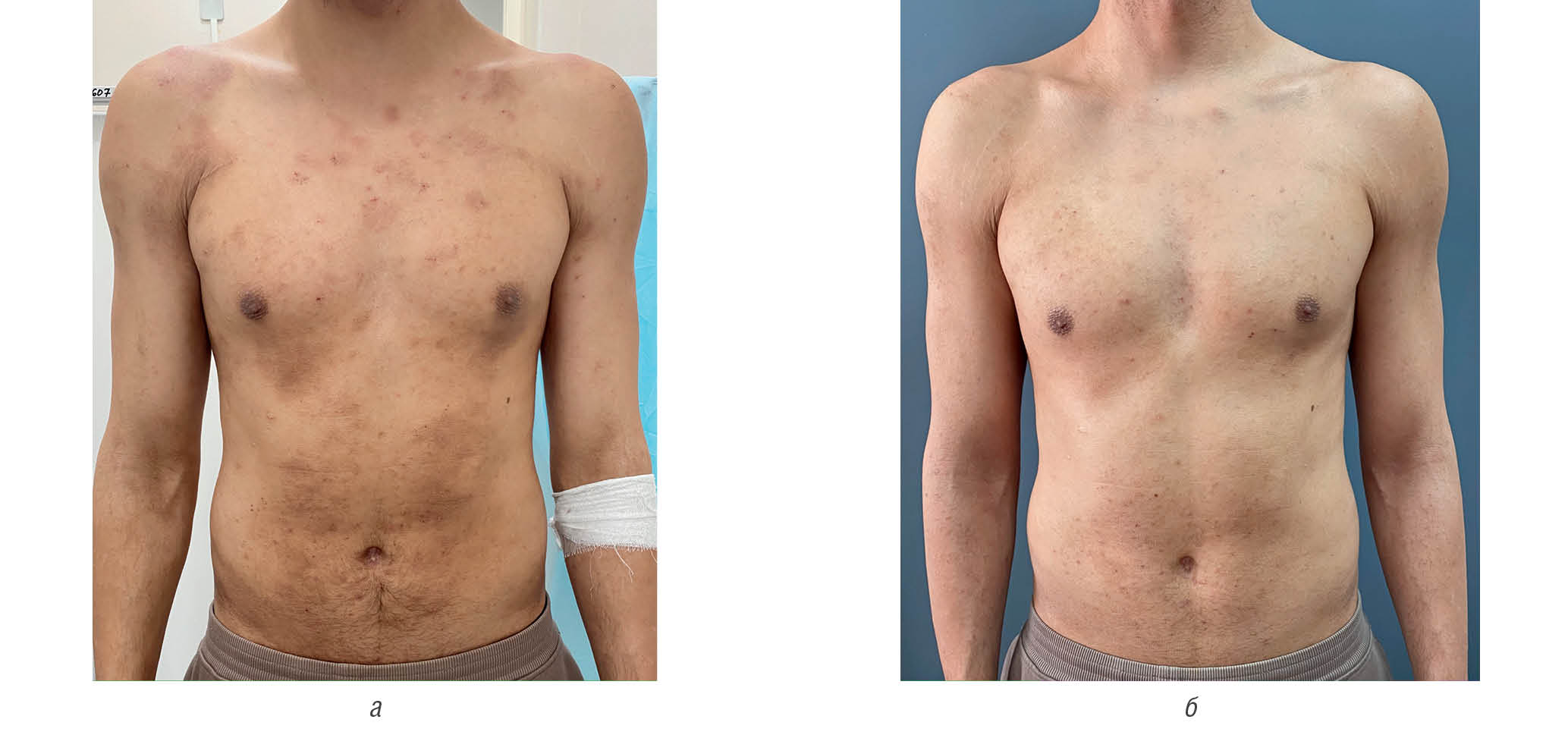 Fig. 23. Patient P., 26 years old. Severe atopic dermatitis before treatment (a) and after application of “Admera” emollient (б)