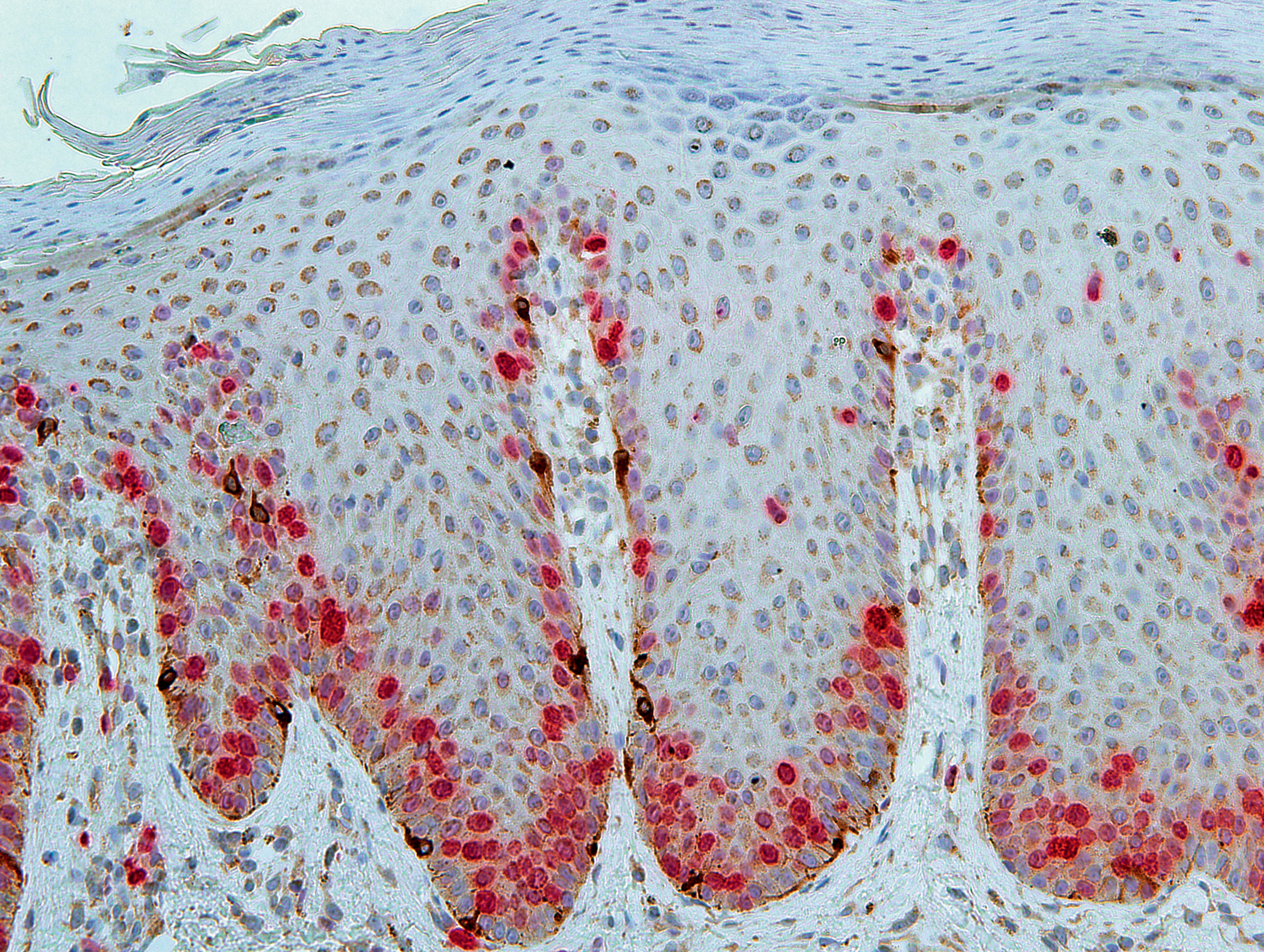 The results of our studies have also confirmed that the absolute number of melanocytes in the affected skin of psoriasis patients has been significantly higher than in the unaffected skin and skin of healthy persons, while the ratio between melanocytes and basal keratinocytes is the same (Fig. 2). It is important to note that no melanocytes in the proliferating stage have been found in all groups except for 1–2 cases (Fig. 3). Thus, we have reached the conclusion that the increased number of melanocytes is not connected with mitosis in the epidermis but probably occurs in the hair follicle bulge where the germ-line cells are located. Fig. 4 shows multiple contacts of MelanA+ and CD8+ cells in the affected skin of psoriasis patients which may be indicative of the immune interaction between these cells (Fig. 4).