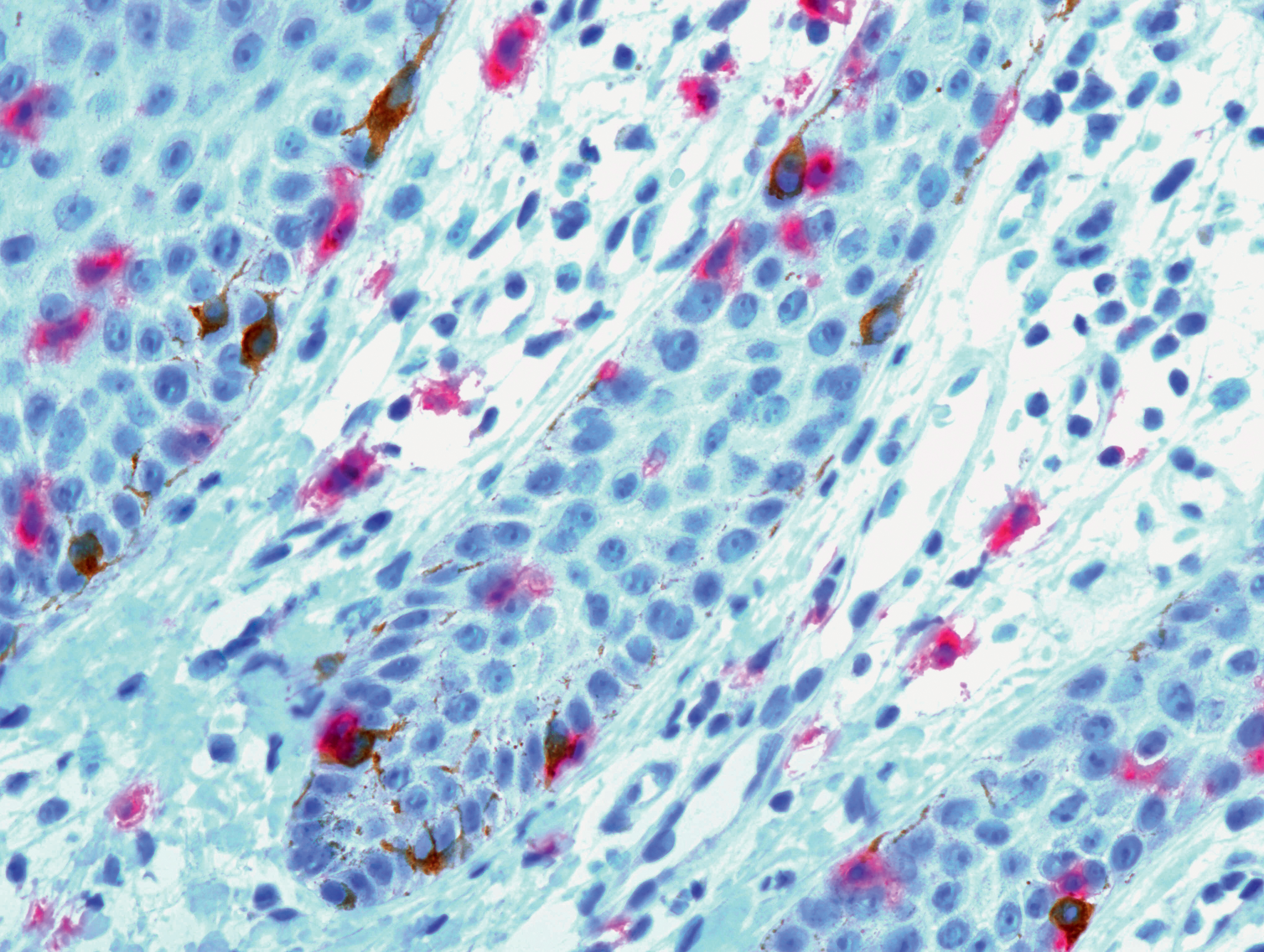 Fig. 4. Immunohistochemical study (dual detection system). The contacts of MelanA+ cells (Bismarck brown staining) and CD8+ cells (neutral red staining) in the epidermis (marked by arrows); magn. ×400, 348 × 253 μm