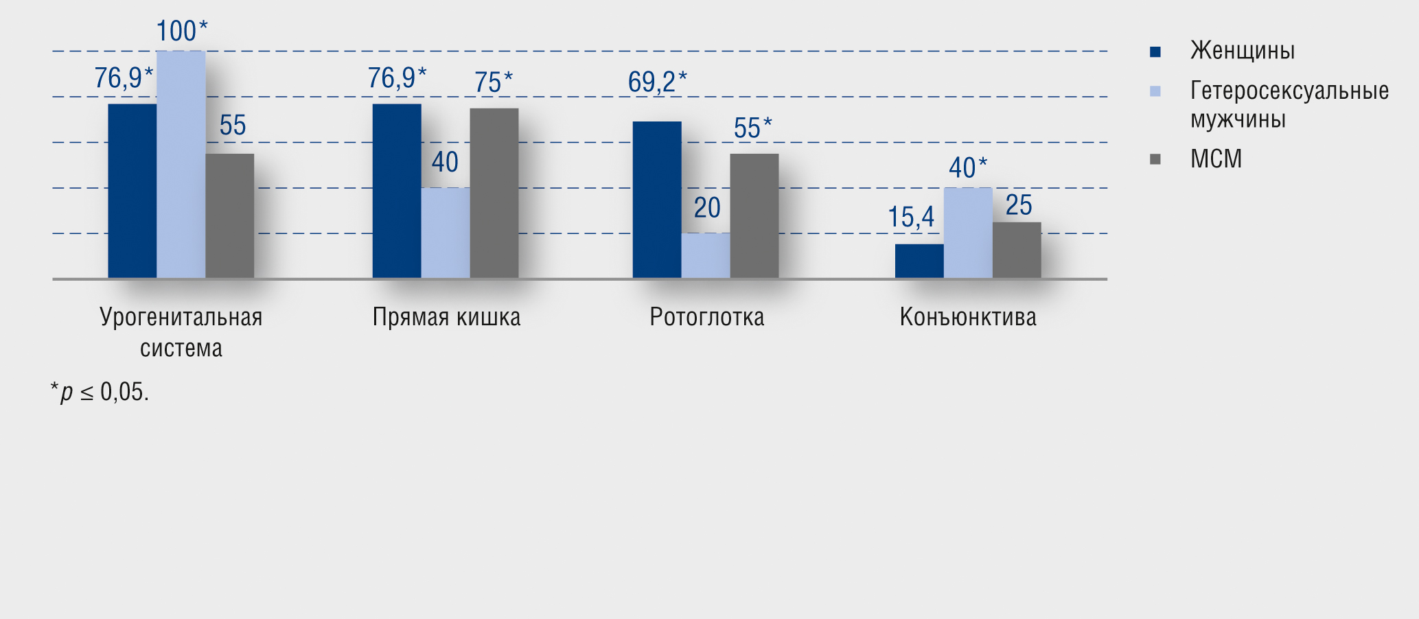 По данным лабораторных исследований, у женщин ИППП чаще выявляли в соскобах из урогенитального тракта, прямой кишки и ротоглотки, реже — в соскобах со слизистой оболочки конъюнктивы. У гетеросексуальных мужчин ИППП были выявлены в уретре, а также в прямой кишке, на слизистой оболочке конъюнктивы, в ротоглотке. У МСМ ИППП чаще обнаруживали в прямой кишке, одинаково часто в уретре и ротоглотке и реже — на слизистой оболочке конъюнктивы (рис. 1).