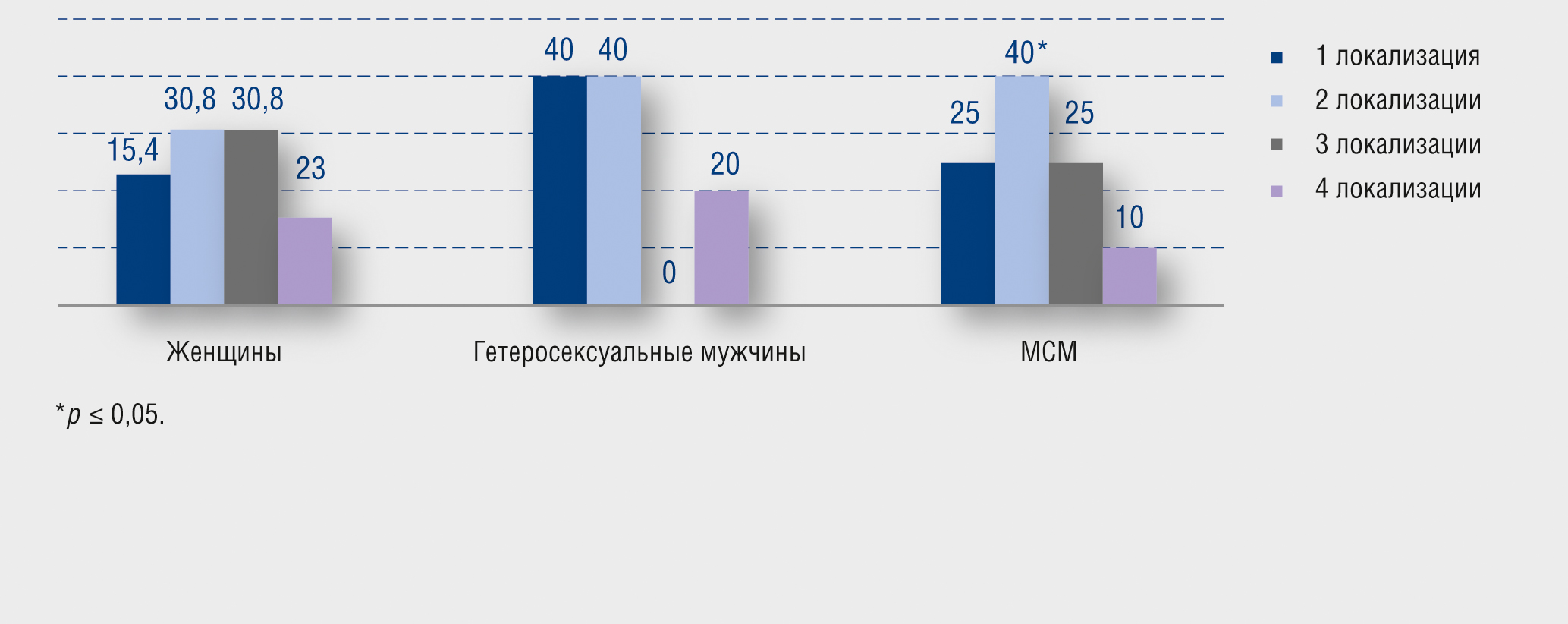 ИППП в одной локализации были выявлены у 3 (23%) женщин: в соскобах из урогенитального тракта (2; 15,4%) и в прямой кишке (1; 7,7%). У 4 (30,8%) пациенток возбудители ИППП определялись в двух локализациях, у 4 (30,8%) пациенток — в трех, у 2 (15,4%) — в четырех локализациях. У гетеросексуальных мужчин возбудители ИППП только в уретре были выявлены у 2 (40%) пациентов, в двух локализациях — у 2 (40%) пациентов, в четырех локализациях — у 1 (20%) пациента. У МСМ ИППП в одной локализации были обнаружены у 5 (25%) пациентов (в уретре (1; 5%), ротоглотке (1; 5%) и в прямой кишке (3; 15%)), в двух локализациях — у 8 (40%) пациентов, в трех локализациях — у 5 (25%) и в четырех локализациях — у 2 (10%) пациентов (рис. 2).
