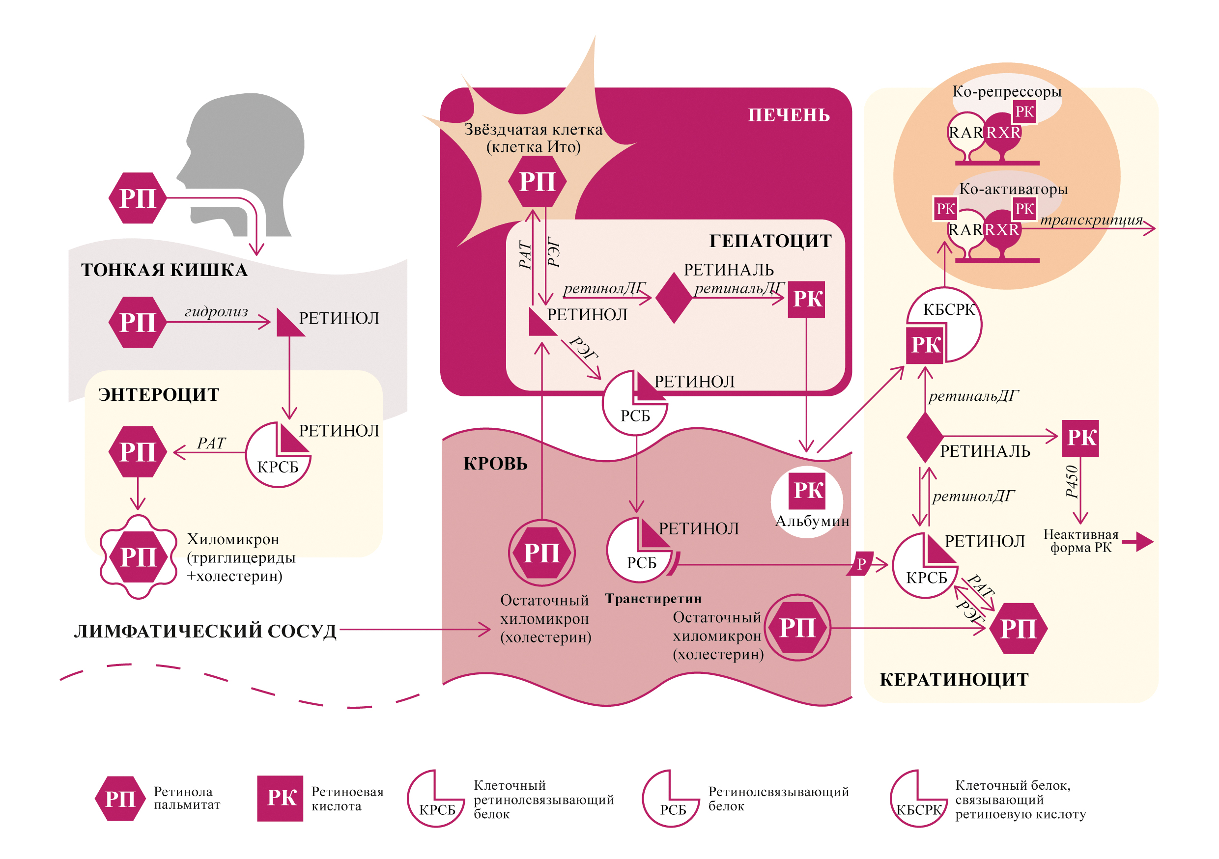 Рис. 1. Внеклеточный и внутриклеточный метаболизм ретинола пальмитата. Ретинола пальмитат (РП) гидролизуется до ретинола в просвете тонкой кишки и поступает в энтероцит. В энтероците ретинол вновь этерифицируется до эфиров ретинола (преимущественно до РП). Эфиры ретинола (преимущественно РП) в составе хиломикронов из кишечника транспортируются через лимфатические пути и затем через кровеносную систему с остатками хиломикронов — в печень. Внутри гепатоцитов эфиры ретинола гидролизуются до ретинола, связываются с ретинолсвязывающим белком (РСБ) и транстиретином и транспортируются кровью к клеткам-мишеням. Если ретинол не нужен, он хранится в звездчатых клетках печени в форме ретиноловых эфиров (преимущественно РП). Ретиноиды достигают клеток-мишеней в основном в виде ретинола в комплексе с РСБ, но также в клетки попадают эфиры ретинола, переносимые остатками хиломикронов, а также полностью транс-ретиноевая кислота (РК), связанная с альбумином. В кератиноците ретинол сначала окисляется до ретиналя, а затем до РК, которая доставляется клеточным белком, связывающим ретиноевую кислоту (КБСРК), в ядро, где активирует RAR-RXR. Условные обозначения: РП — ретинола пальмитат; РК — ретиноевая кислота; Р — рецептор к ретинолсвязывающему белку; КРСБ — клеточный ретинолсвязывающий белок; РАТ — ретинолацилтрансфераза; ретинолДГ — ретинолдегидрогеназа; ретинальДГ — ретинальдегидрогеназа; РЭГ — ретинилэфиргидролаза