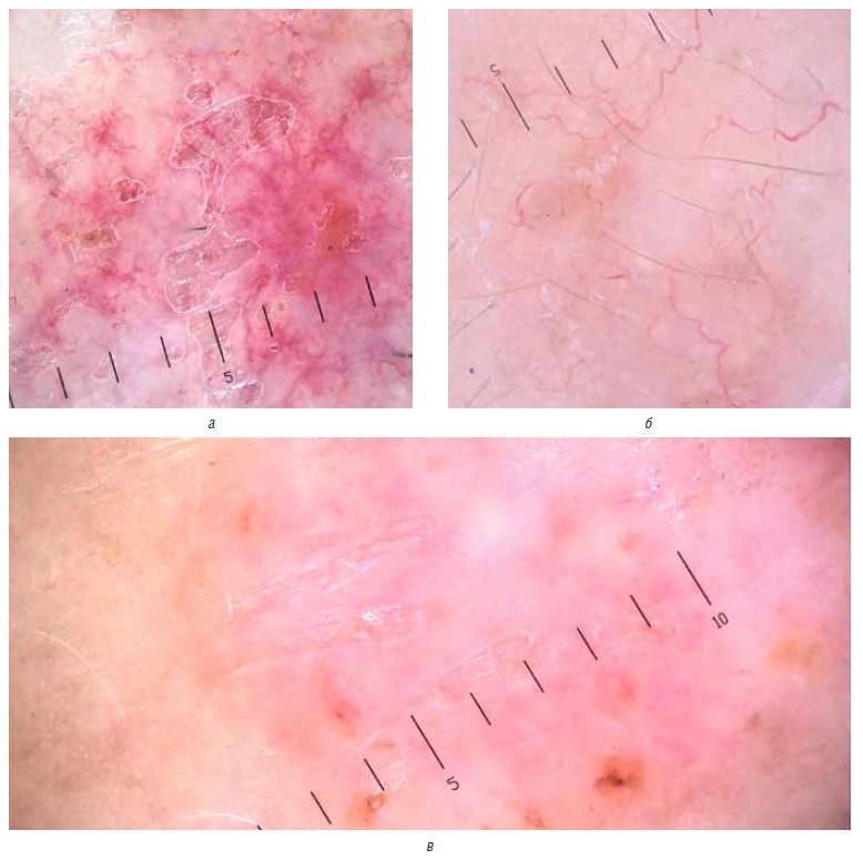 Рис. 1. Сосудистые феномены, выявляемые при дерматоскопии очагов базальноклеточного рака кожи. Описание в тексте: а — короткие мелкие телеангиэктазии, б — ветвящиеся древовидные сосуды, в — молочно-розовые области / фон