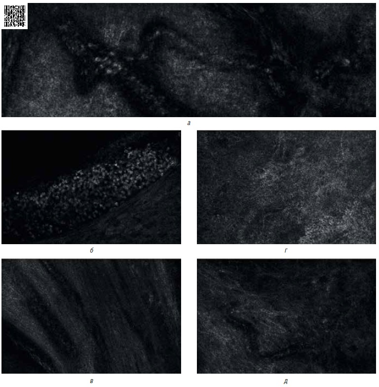 Рис. 2. Типы сосудов в очагах базальноклеточного рака кожи по данным прижизненной конфокальной лазерной микроскопии. Описание в тексте: а — ветвящиеся сосуды, б — каналикулярные, в — прямолинейные, г — изогнутые, д — комбинированные