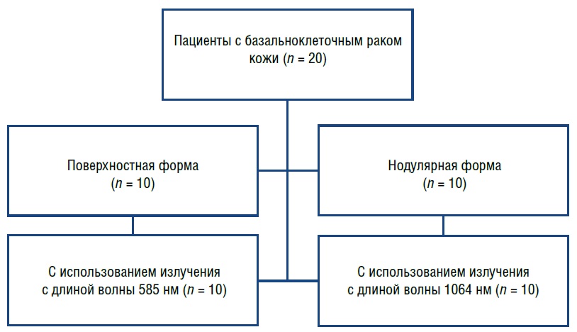 Пациенты с очагами нодулярной формы базальноклеточного рака кожи (схема) получали терапию с использованием лазерного излучения с длиной волны 1064 нм, основанную на избирательной адсорбции данного вида энергии оксигенированной и в большей степени дезоксигенированной формой гемоглобина эритроцитов крови. В результате воздействия лазерного излучения происходит нагревание содержимого кровеносного сосуда до температуры выше 75 °С, что вызывает контракцию коллагеновых волокон сосудистой стенки, приводящую к облитерации просвета сосуда.