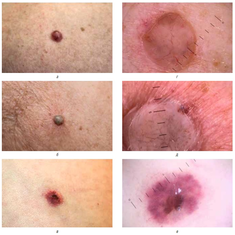 Рис. 3. Клиническая и дерматоскопическая картина в процессе лечения пациента с нодулярной формой базальноклеточного рака кожи с помощью лазерного излучения с длиной волны 1064 нм. Макроскопическая фотография (а) и дерматоскопическое изображение (б) — до процедуры, макроскопическая фотография (в) и дерматоскопическое изображение (г) — сразу после процедуры (появление серого оттенка на области воздействия), макроскопическая фотография (д) и дерматоскопическое изображение (е) — через 1 месяц после процедуры