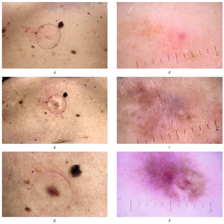 Рис. 4. Клиническая и дерматоскопическая картина в процессе лечения пациента с поверхностной формой базальноклеточного рака кожи с помощью лазерного излучения с длиной волны 585 нм. Макроскопическая фотография (а) и дерматоскопическое изображение (б) — до процедуры, макроскопическая фотография (в) и дерматоскопическое изображение (г) — сразу после процедуры (появление пурпуры на области воздействия), макроскопическая фотография (д) и дерматоскопическое изображение (е) — через 1 месяц после процедуры