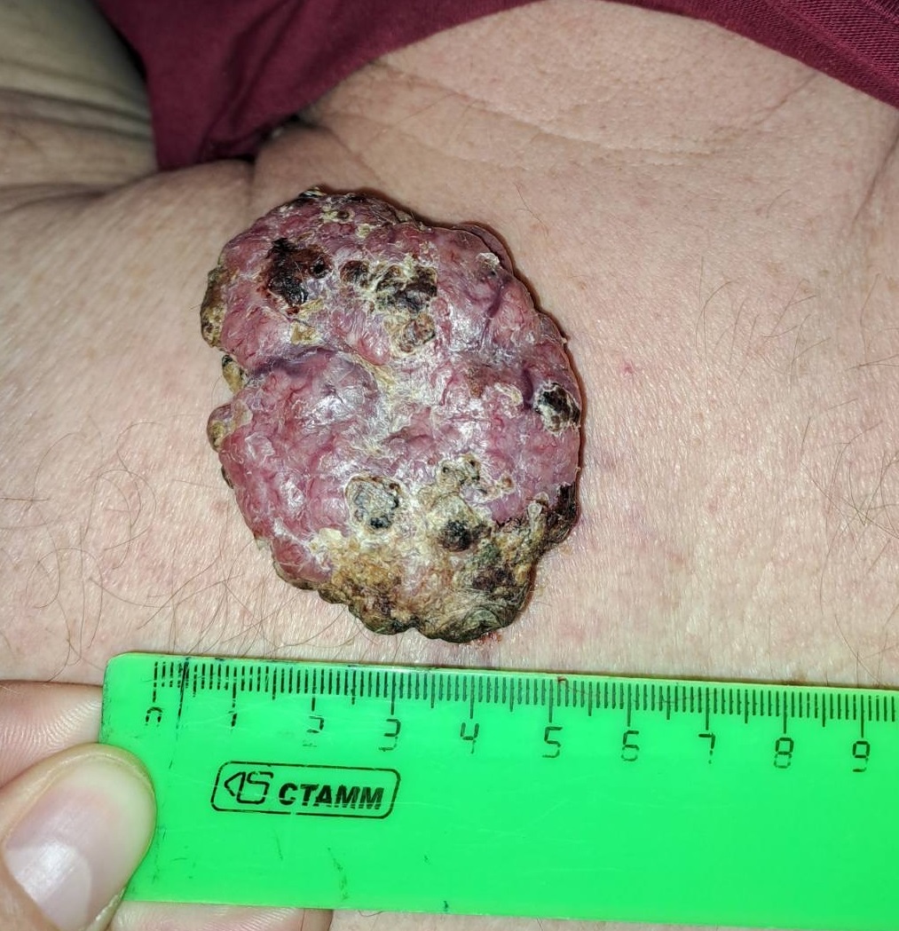 Анамнез заболевания: отмечает появление новообразования около 15 лет назад, в течение последних 2 лет наблюдаются повышенная кровоточивость опухоли, образование толстых геморрагических корок. К дерматологу, хирургу и онкологу ранее не обращался. Причины запущенности — страх оперативного вмешательства (томофобия) и последующего летального исхода (танатофобия).