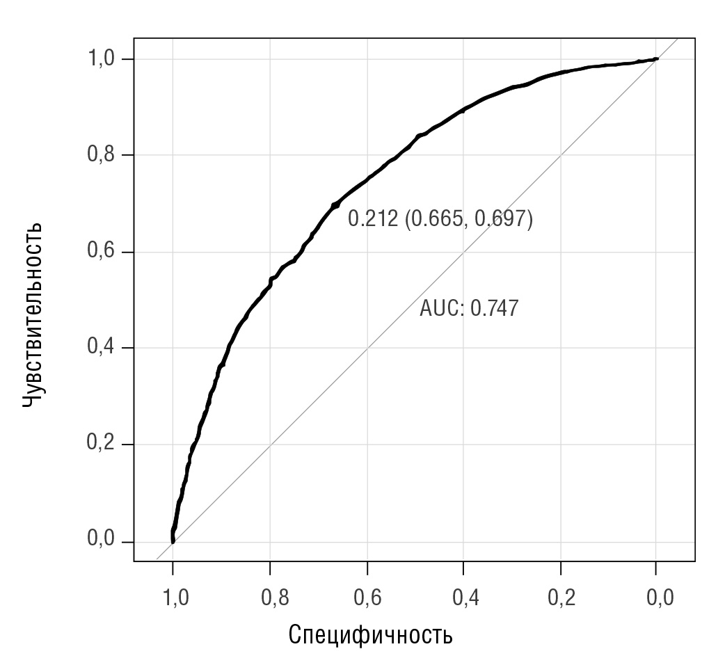 По результатам ROC-анализа модели, полученной на объединенных данных, AUC под ROC-кривой была равна 0,7473, чувствительность модели классификации составила 70%, специфичность — 66% при точке отсечения 0,212 (рис. 1).