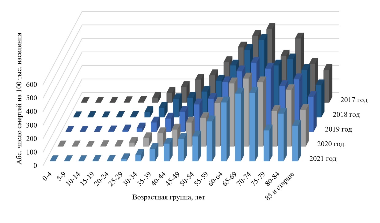 Fig. 1. Dynamics of the mortality rate from skin melanoma in absolute numbers of deaths per 100,000 population in various age groups in both sexes in the period from 2017 to 2021 in the Russian Federation