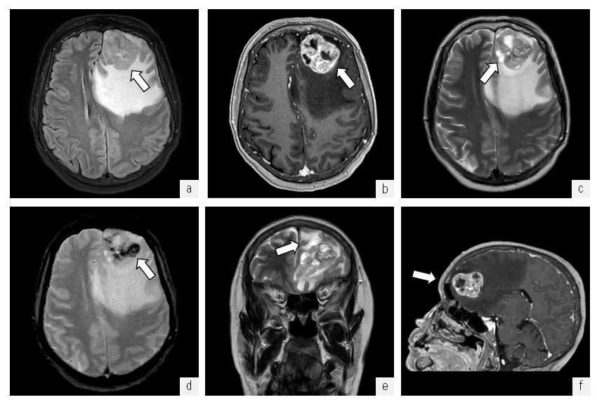 Рис. 2. МРТ головного мозга. Объемное образование левой лобной области: a — МРТ в режиме FLAIR в аксиальной проекции, определяется объемное образование гетерогенно-гиперинтенсивной структуры с неровными контурами (стрелка) и выраженным перифокальным отеком, срединные структуры и боковые желудочки деформированы, смещены; б — МРТ в режиме T1 ISO с контрастным усилением в аксиальной проекции, отмечается активное неоднородное накопление контрастного препарата в структуре опухоли (стрелка); в — МРТ в режиме Т2 в аксиальной проекции, отмечаются жидкостные (некротические?) включения в структуре объемного образования (стрелка); г — МРТ в режиме Т2GRE* в аксиальной проекции, определяются включения отложений продуктов биодеградации гемосидерина в структуре объемного образования (стрелка); д — МРТ в режиме Т2 в корональной проекции, отмечается распространенная зона вазогенного отека вещества головного мозга (стрелка); е — МРТ в режиме T1 ISO с контрастным усилением в сагиттальной проекции (стрелка)