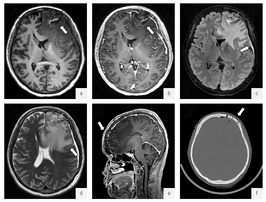 Рис. 3. МРТ и КТ головного мозга. Опухоль левой лобной доли, состояние после хирургического удаления опухоли: a — МРТ в режиме IR-FSPGR в аксиальной проекции, отмечается постоперационная полость (стрелка), выполненная ликворным и геморрагическим содержимым; б — МРТ в режиме IR-FSPGR с контрастным усилением в аксиальной проекции, отмечается умеренное, неравномерное накопление контрастного препарата по периферии послеоперационной полости (стрелка); в — МРТ в режиме Т2-FLAIR в аксиальной проекции, субдурально определяется серповидный участок повышенного относительно ликвора МР-сигнала толщиной до 0,7 см; г — МРТ в режиме Т2 в аксиальной проекции, отмечается распространенная зона вазогенного отека вещества головного мозга левого полушария с признаками дислокации срединных структур и боковых желудочков; д — МРТ в режиме IR-FSPGR с контрастным усилением в сагиттальной проекции; е — КТ головного мозга, костный режим, определяется зона оперативного доступа (стрелка), костный лоскут располагается ровно