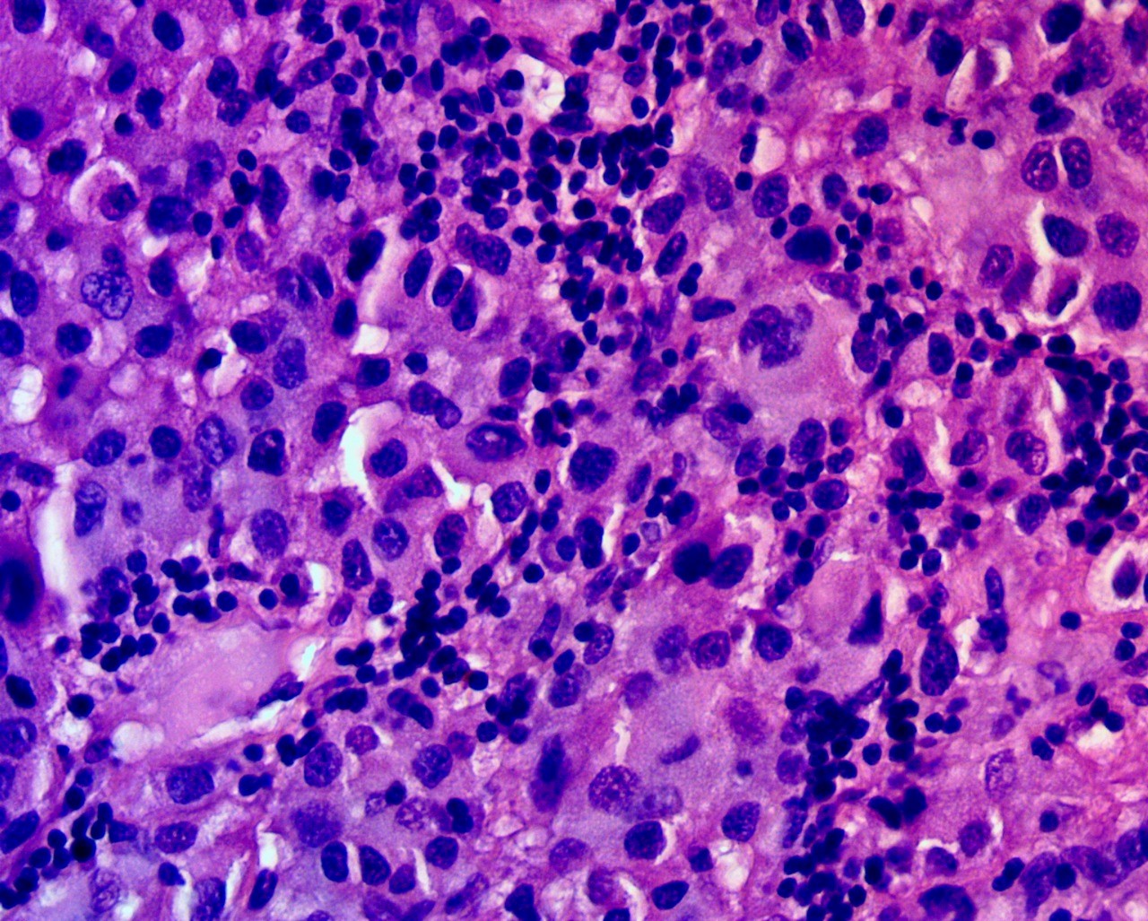 Патоморфологическое заключение: гистоморфологическая картина метастаза беспигментной эпителиоидной меланомы в ГМ.